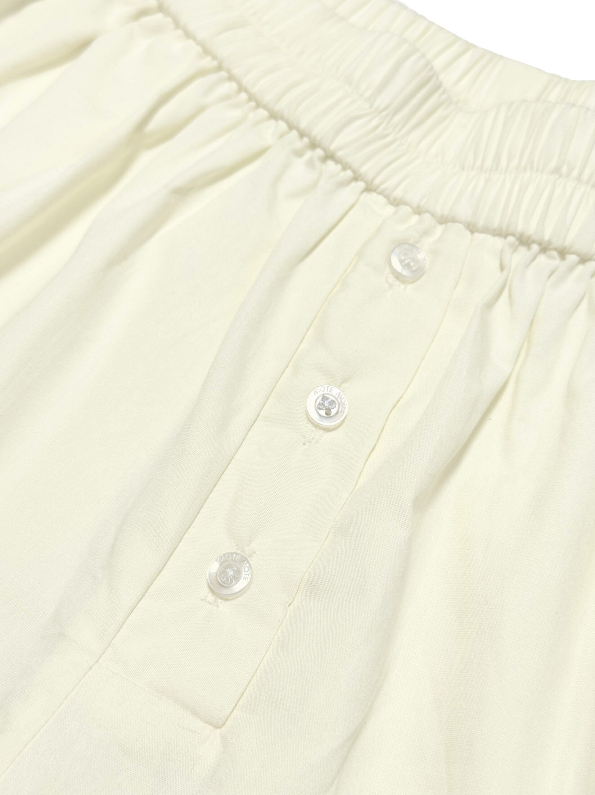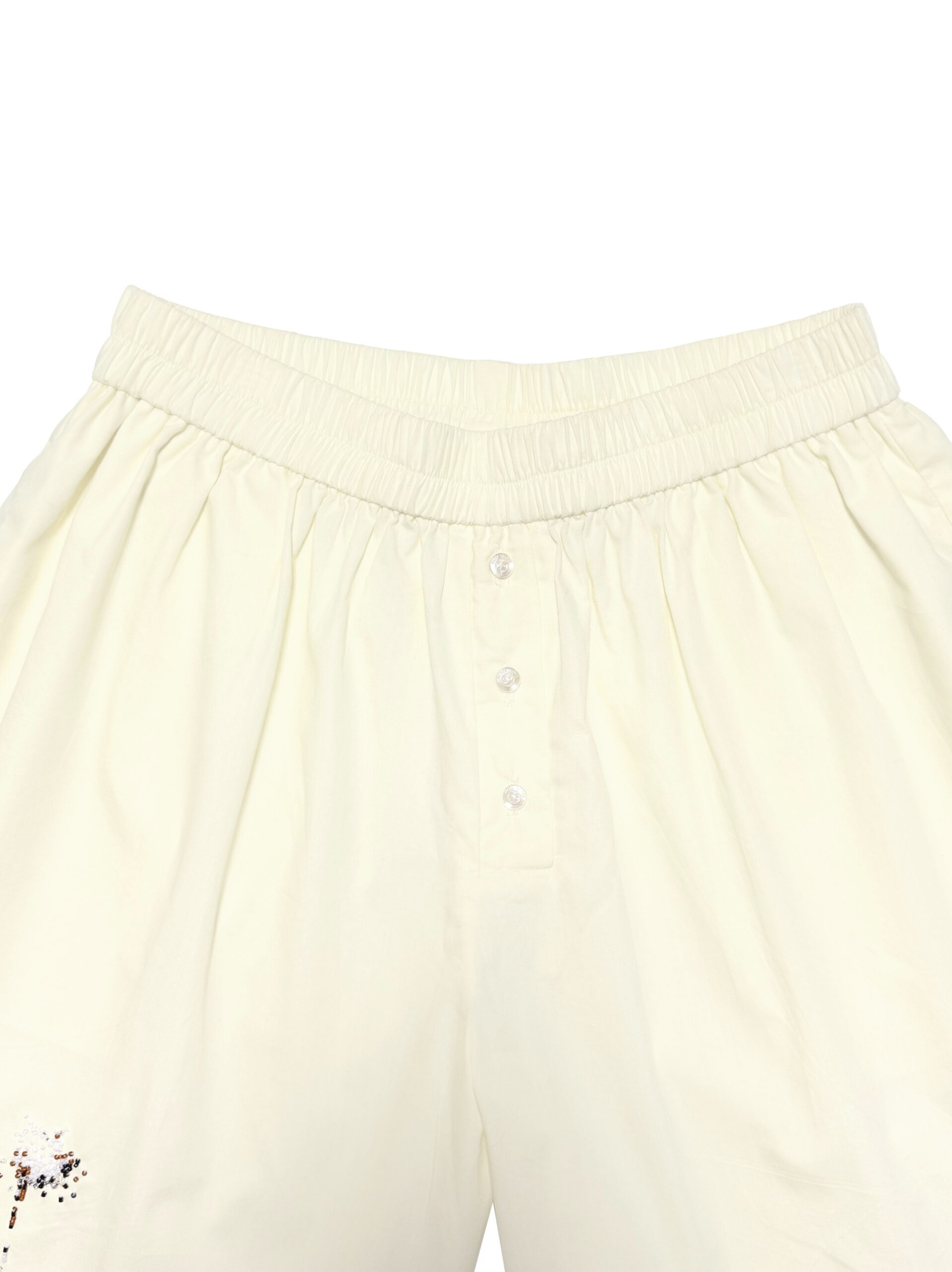 Loose-cut shorts designed with a relaxed silhouette and elastic waistband for all-day comfort. Featuring front button detailing and signature patch label. Embellished with hand-beaded cords on the side for a playful finishing touch.