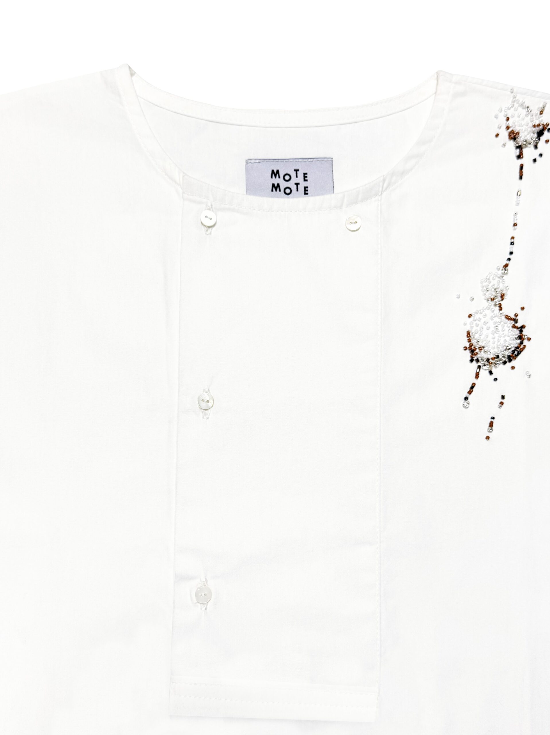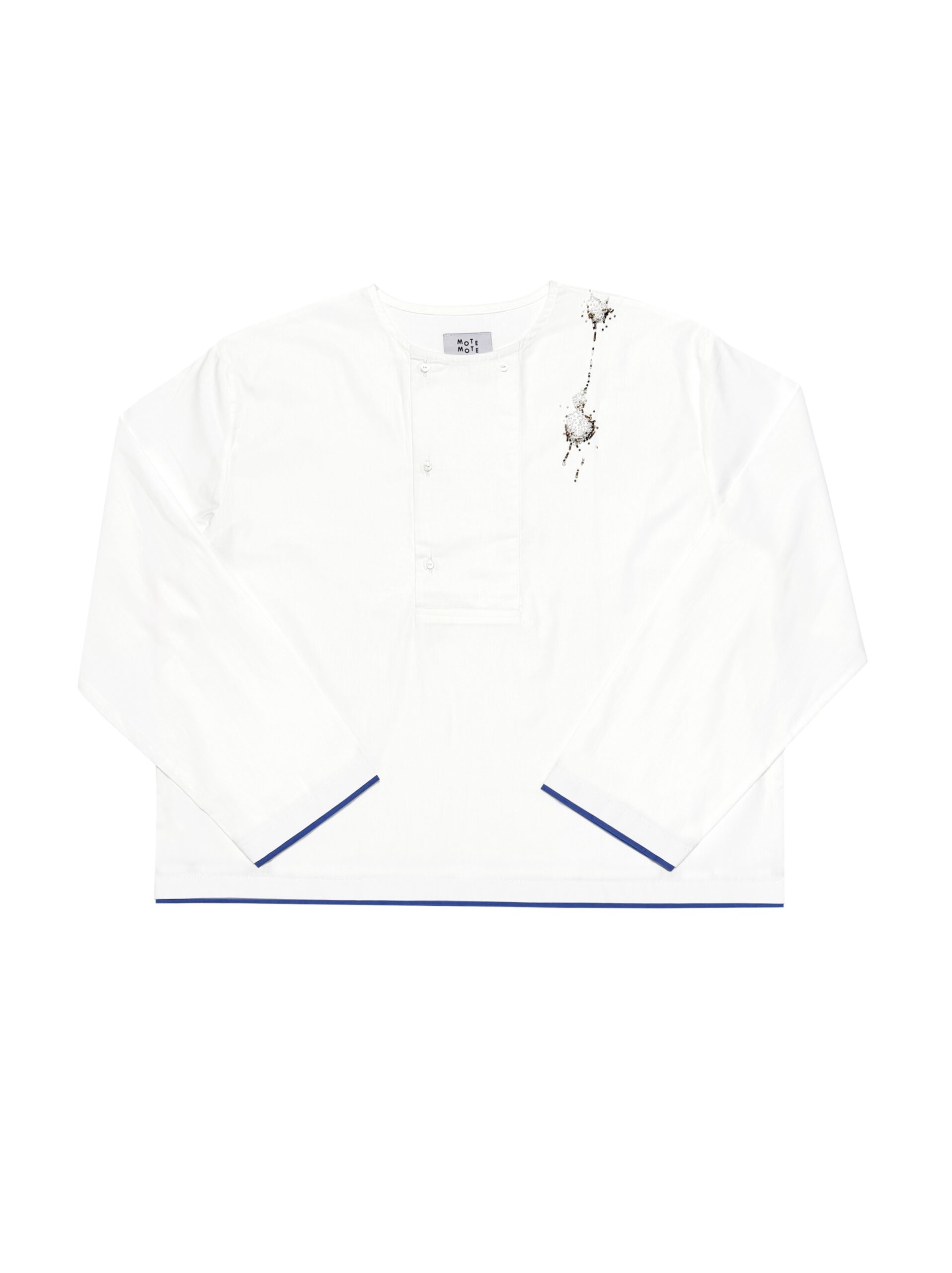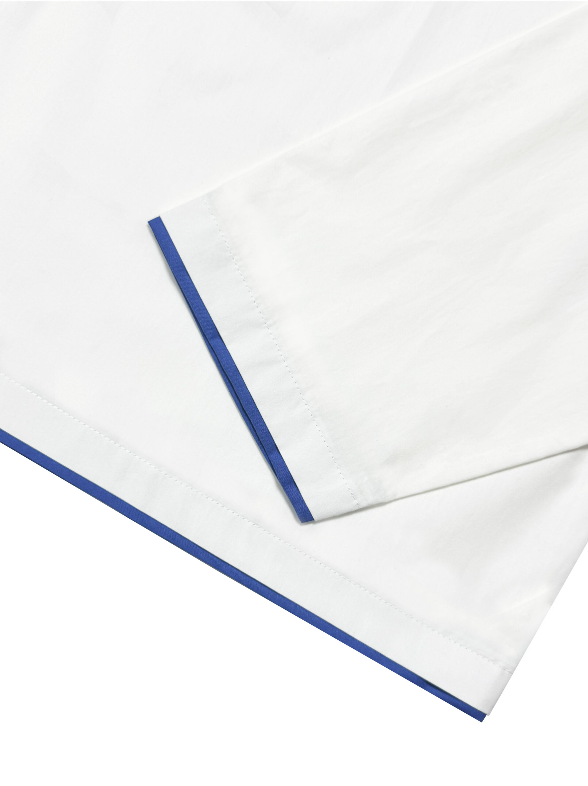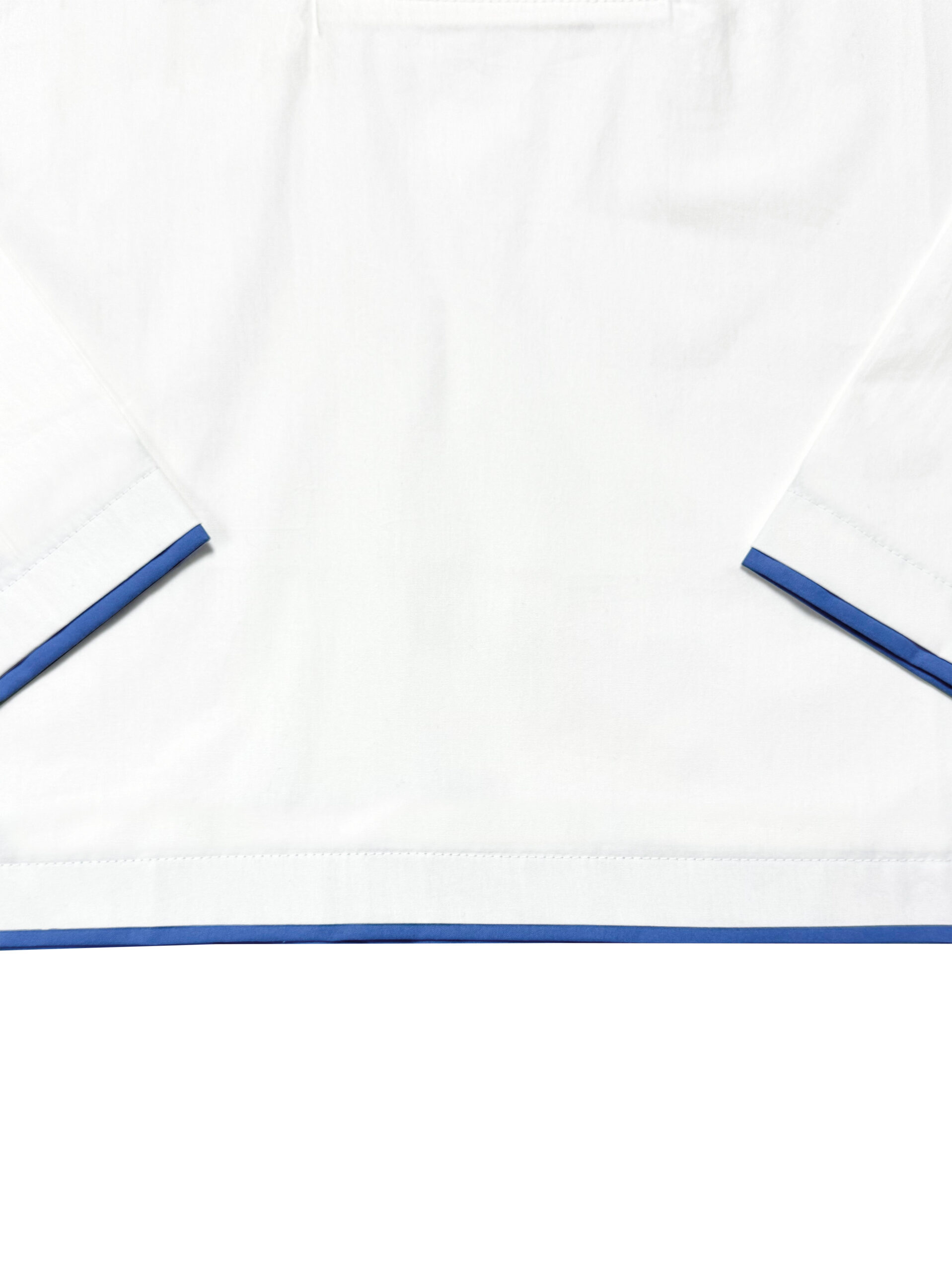Designed with a relaxed unisex cut, this cotton poplin top features long sleeves and a clean round neckline. Detailed with hand-applied bead embellishment and finished with subtle blue piping along the hem and cuffs for a refined contrast.