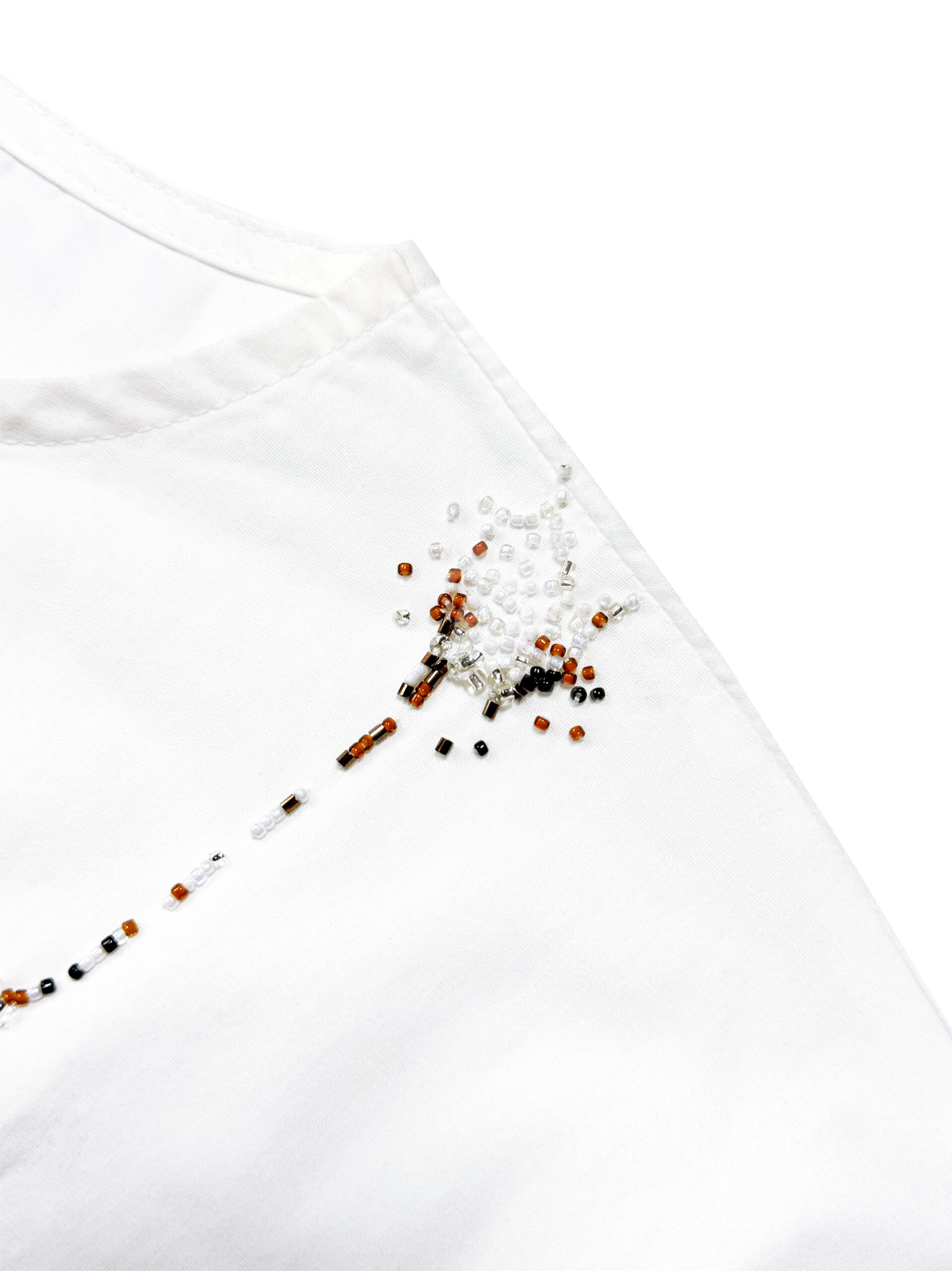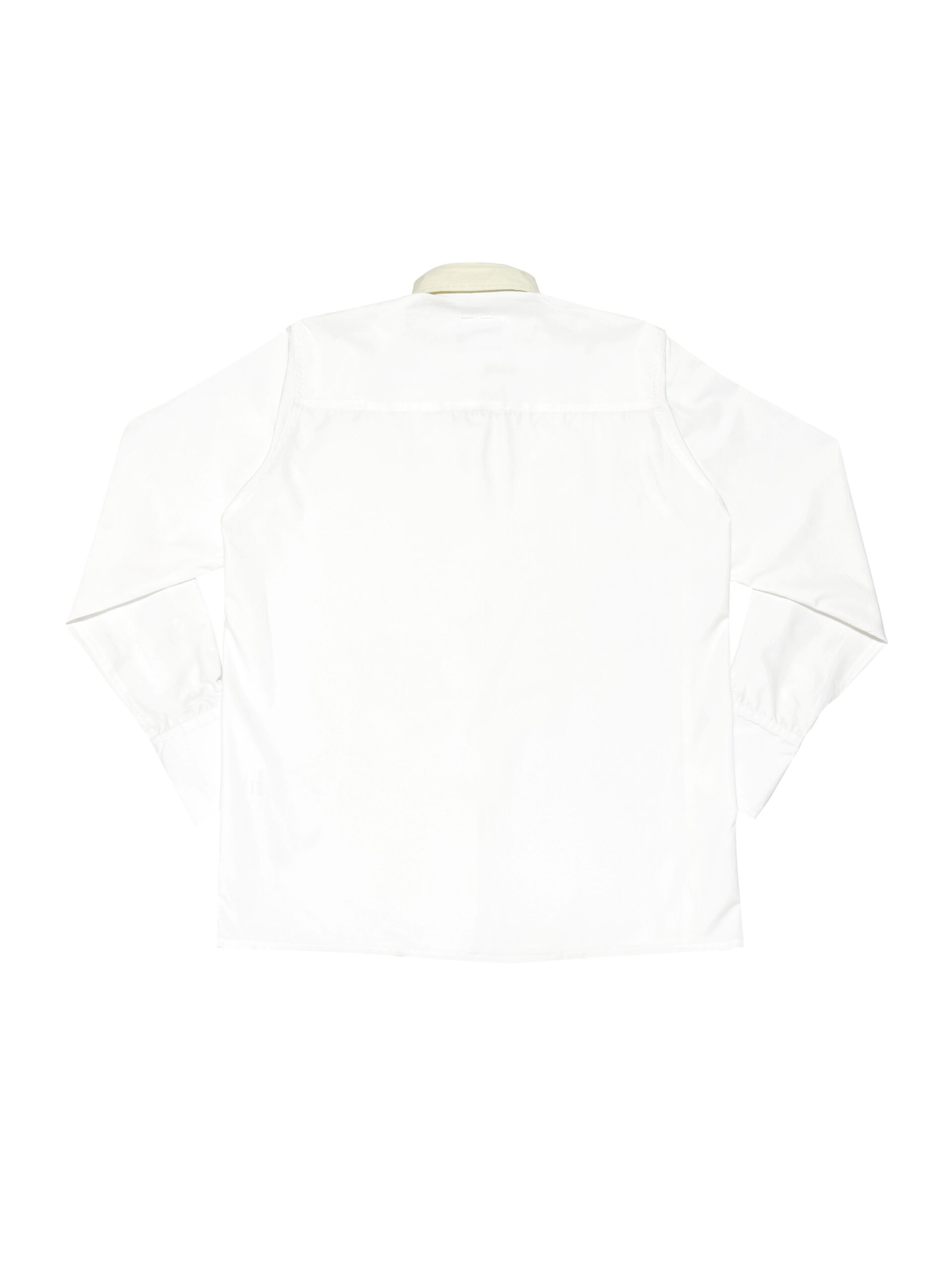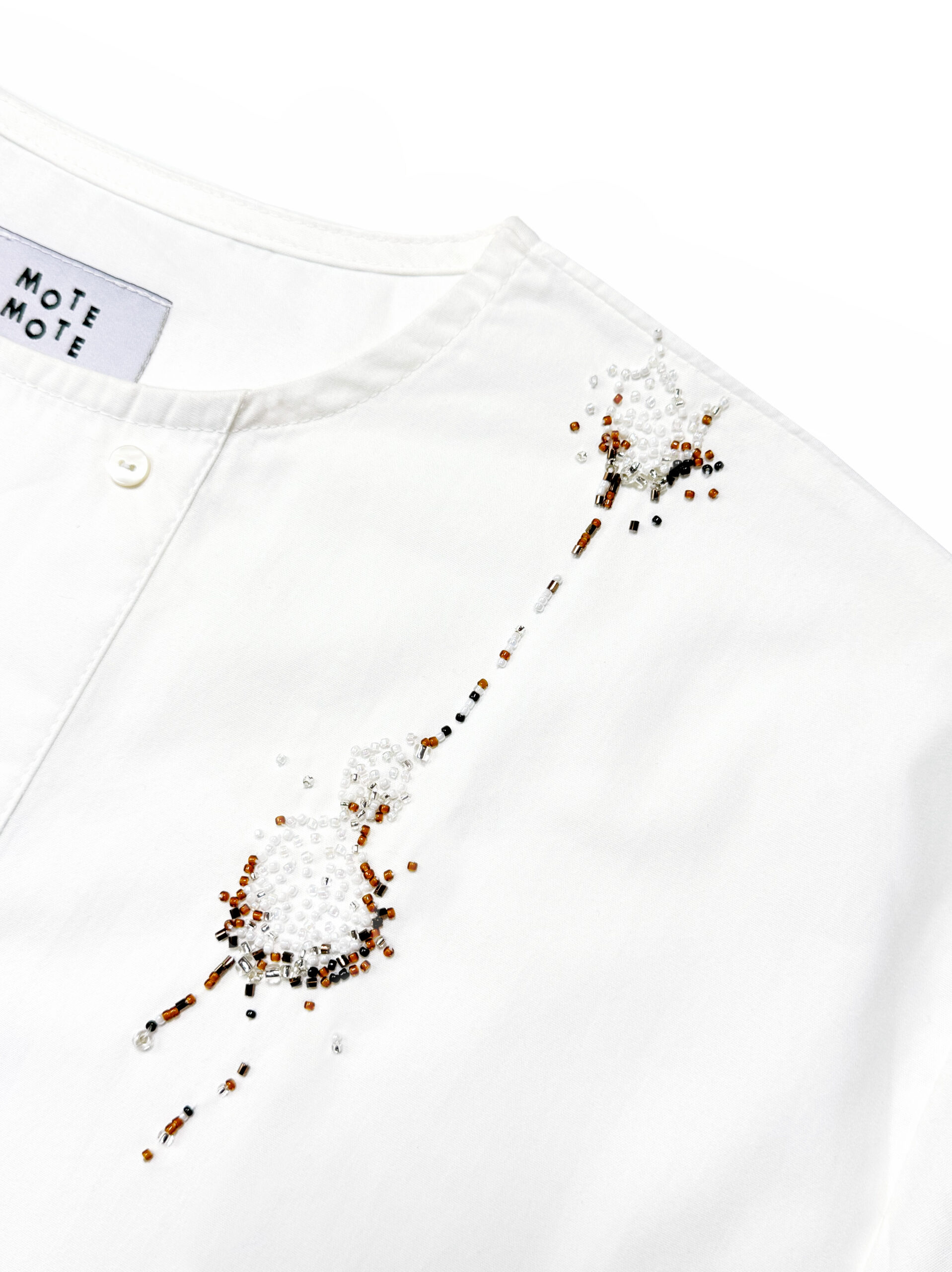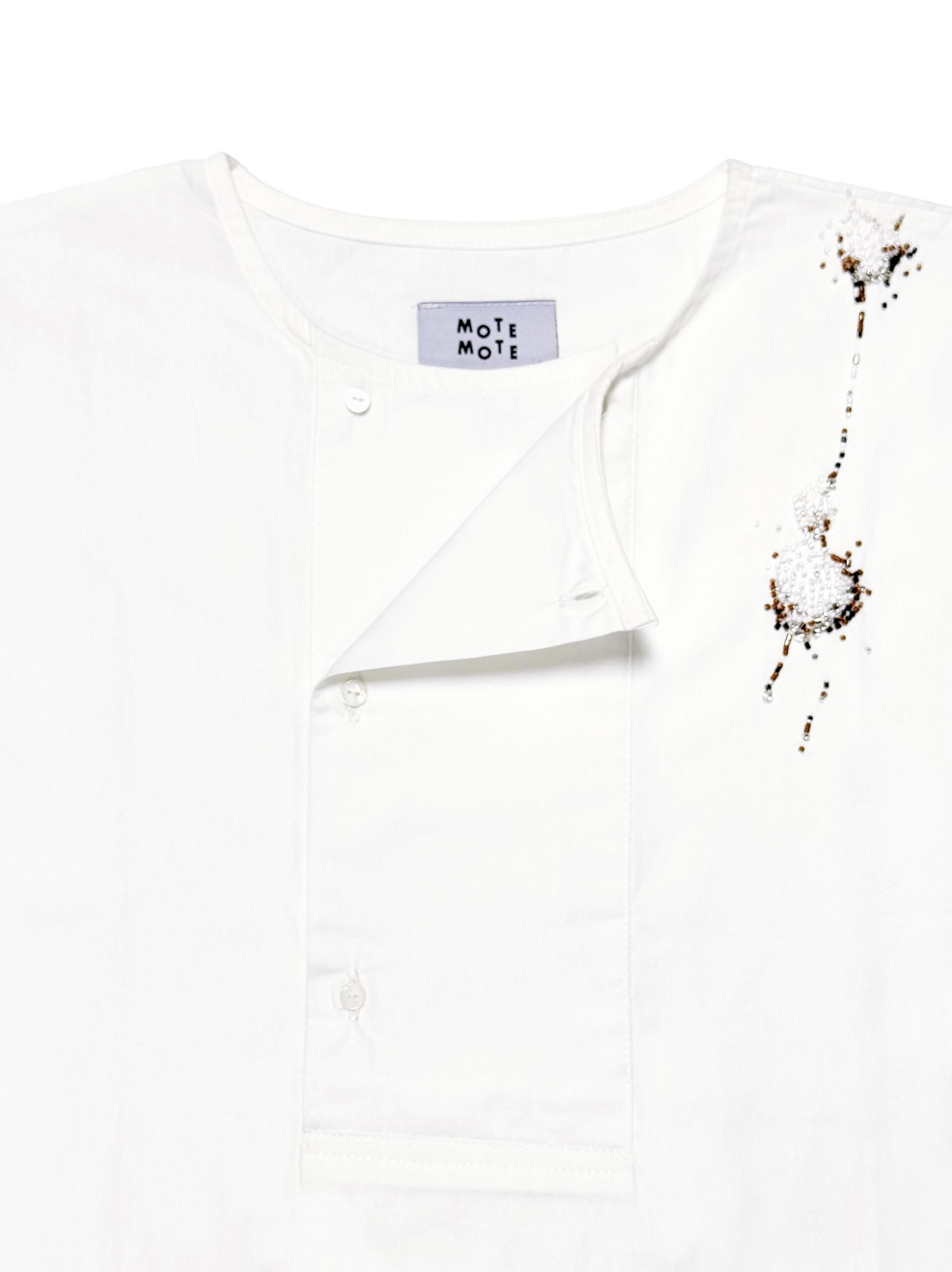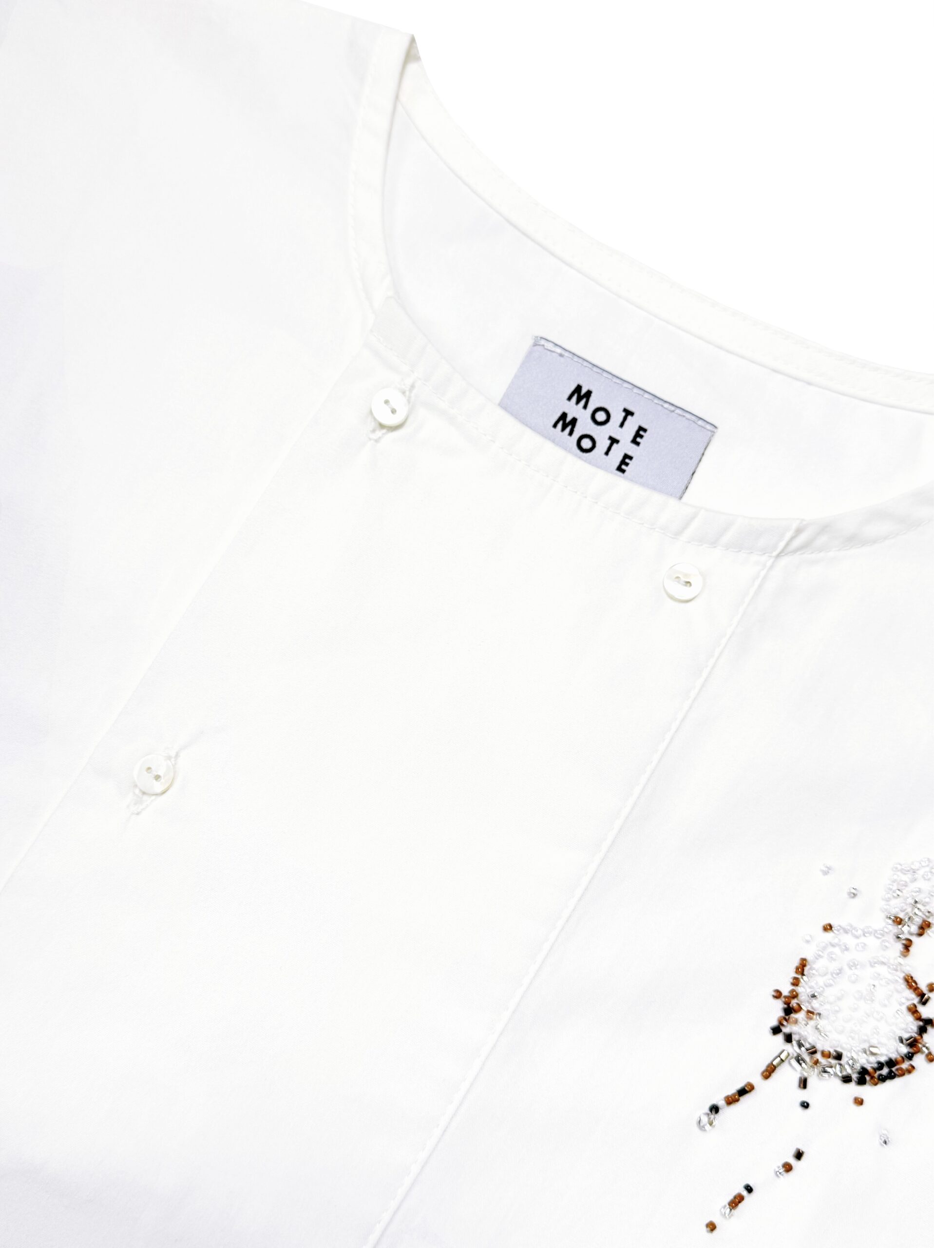 Designed with a relaxed unisex cut, this cotton poplin top features long sleeves and a clean round neckline. Detailed with hand-applied bead embellishment and finished with subtle blue piping along the hem and cuffs for a refined contrast.