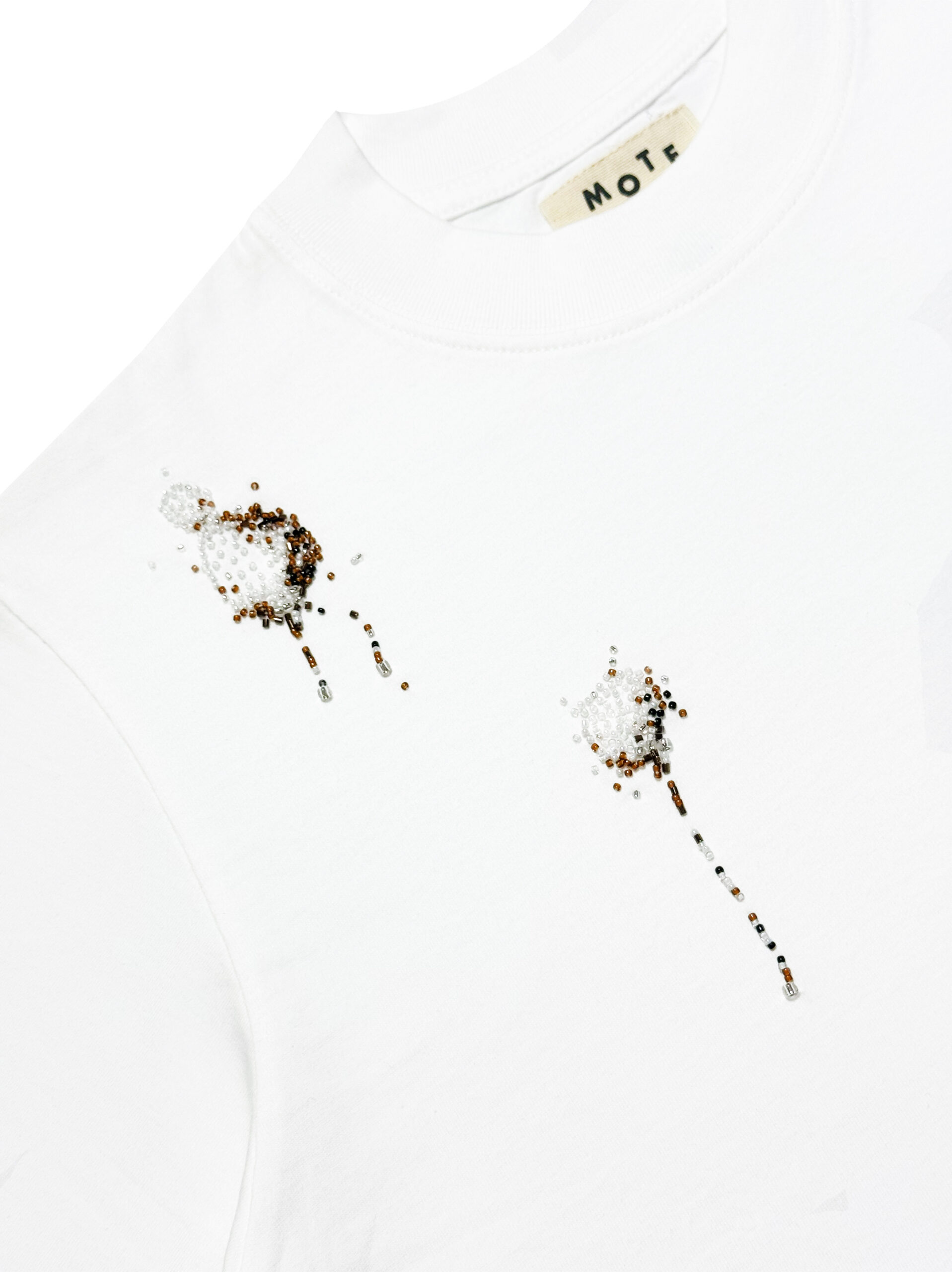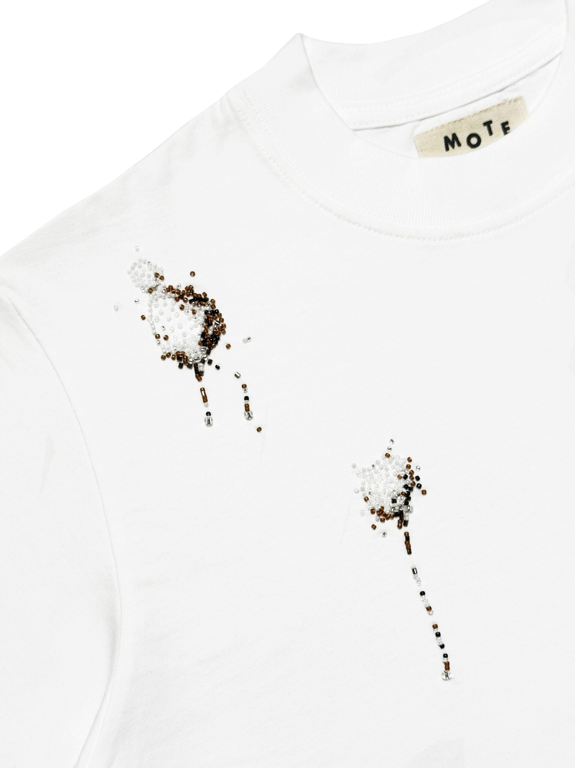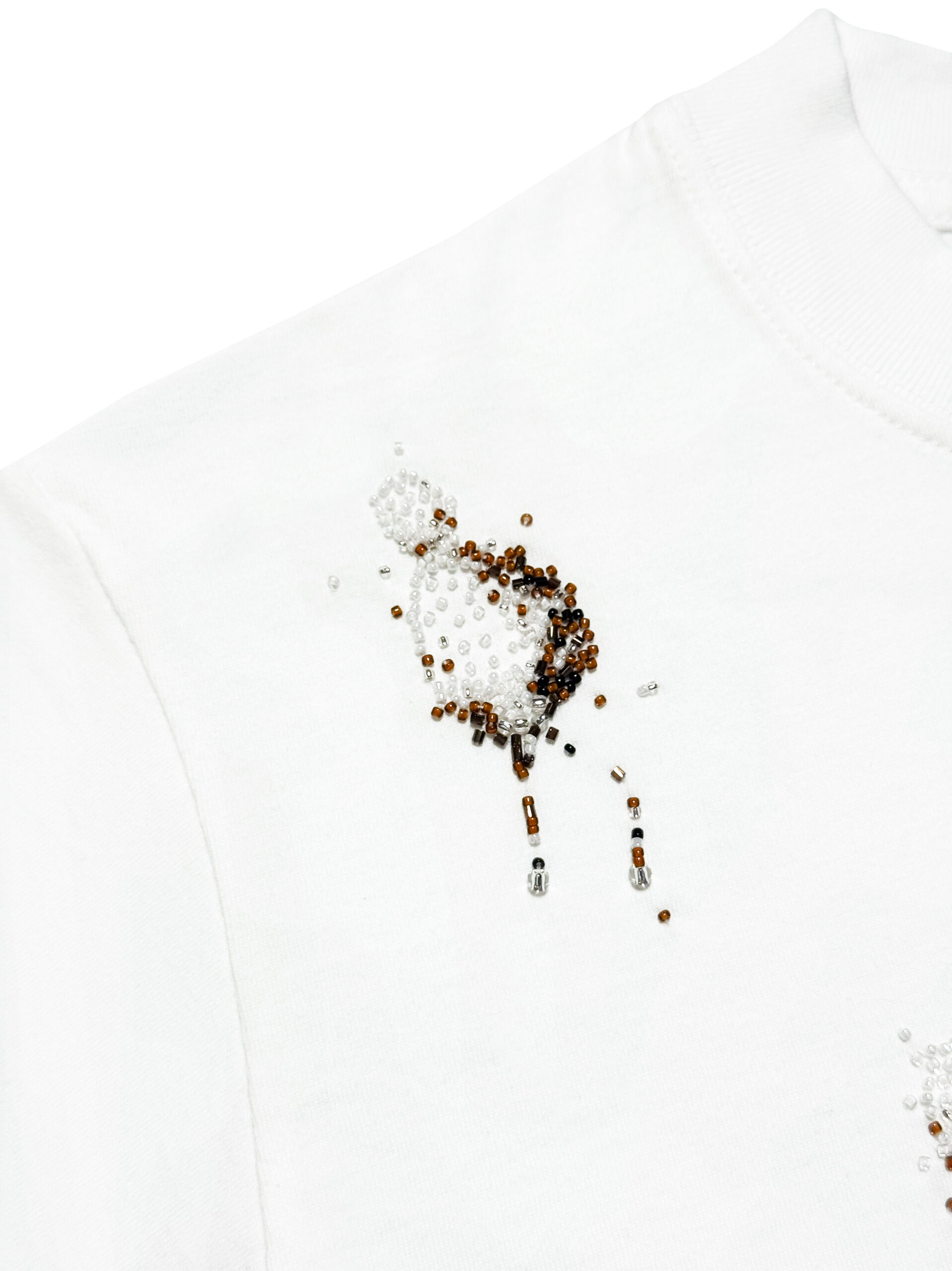 Oversized cut crew neck Tee in soft cotton, made in unisex fitting. Adorned with playful vibrant hand-beaded details in collaborative materials.