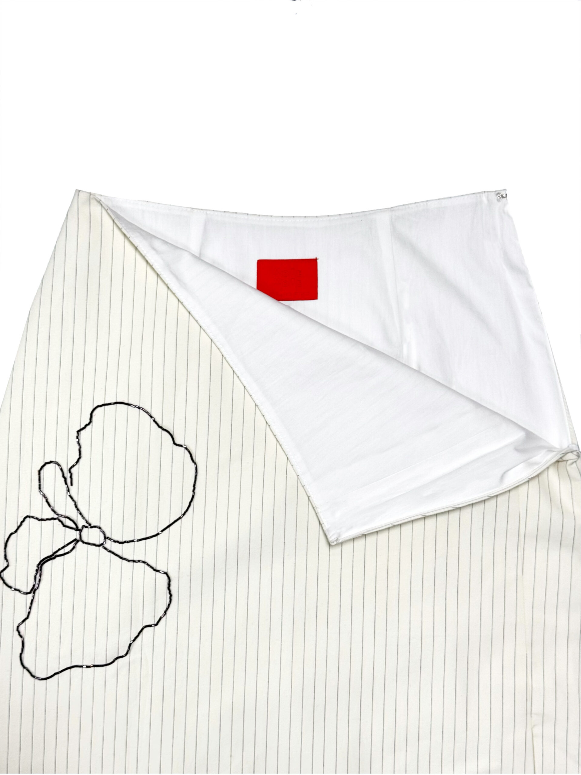Holiday edition of our midi skirt with front slits, featuring hand-crafted embellishment details made of glass beads, finished with side-zip opening, straight hem and interlining.