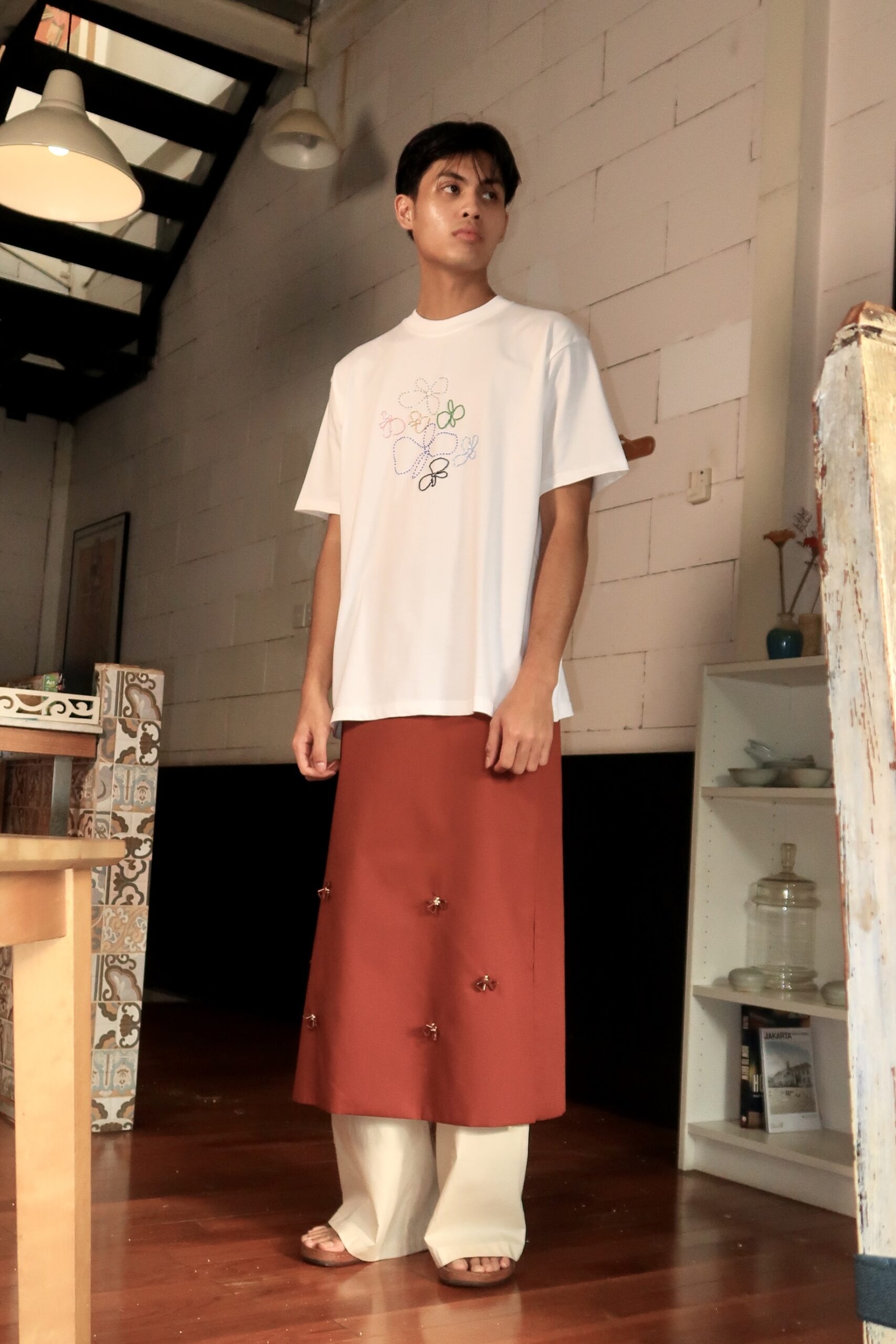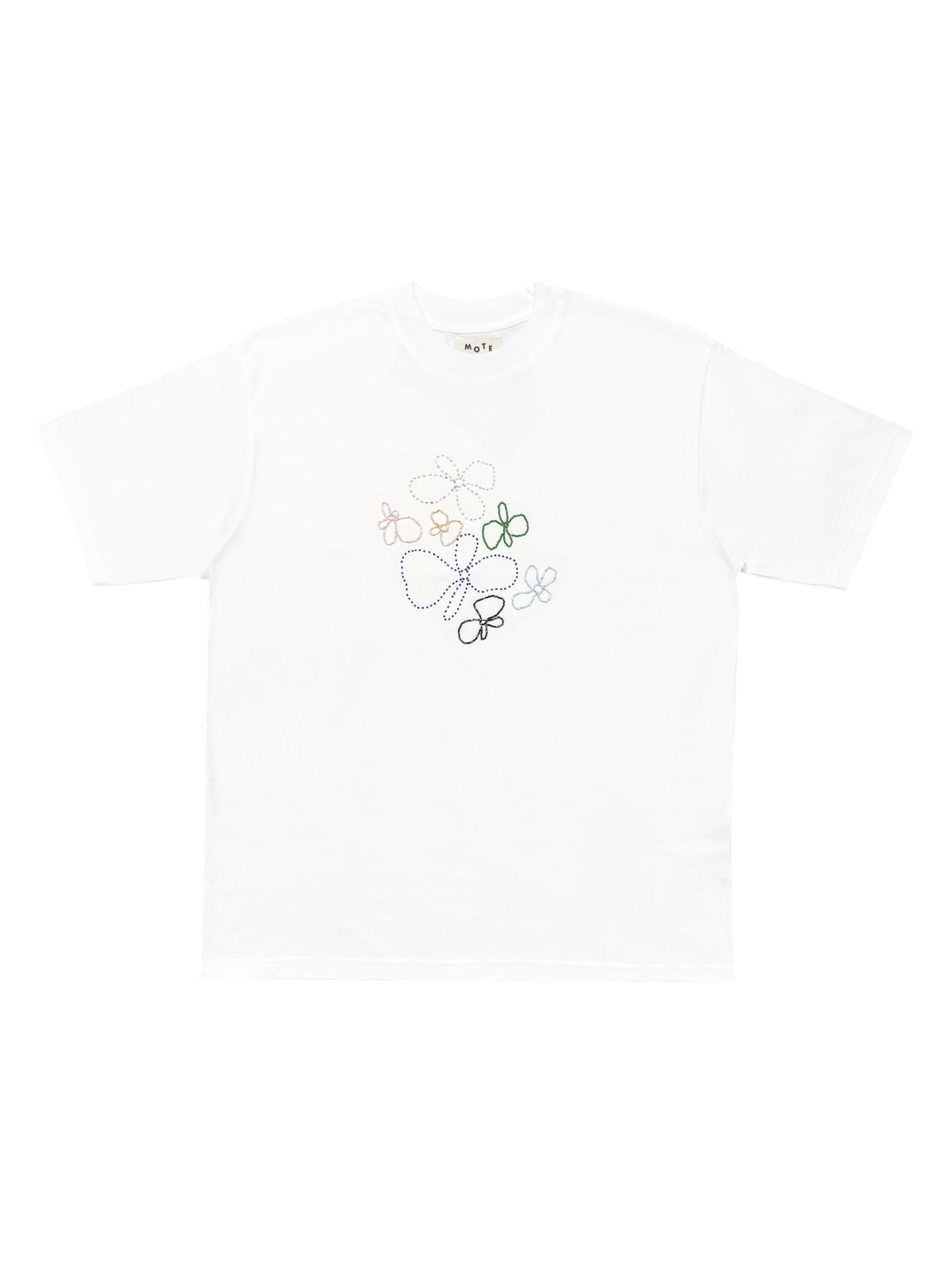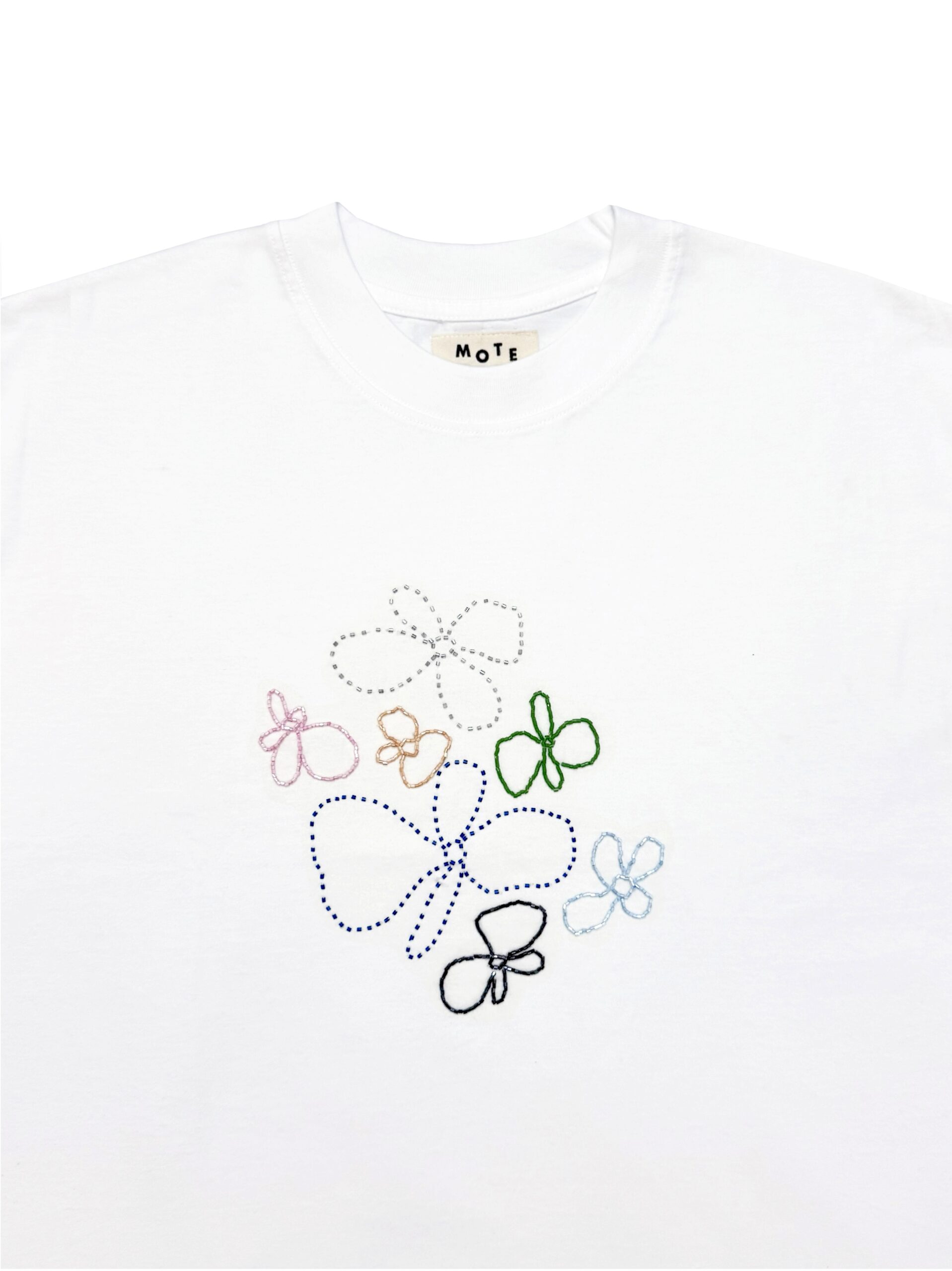 Oversized cut crew neck Tee in soft cotton, made in unisex fitting. Adorned with multicolored floral beading ornaments.