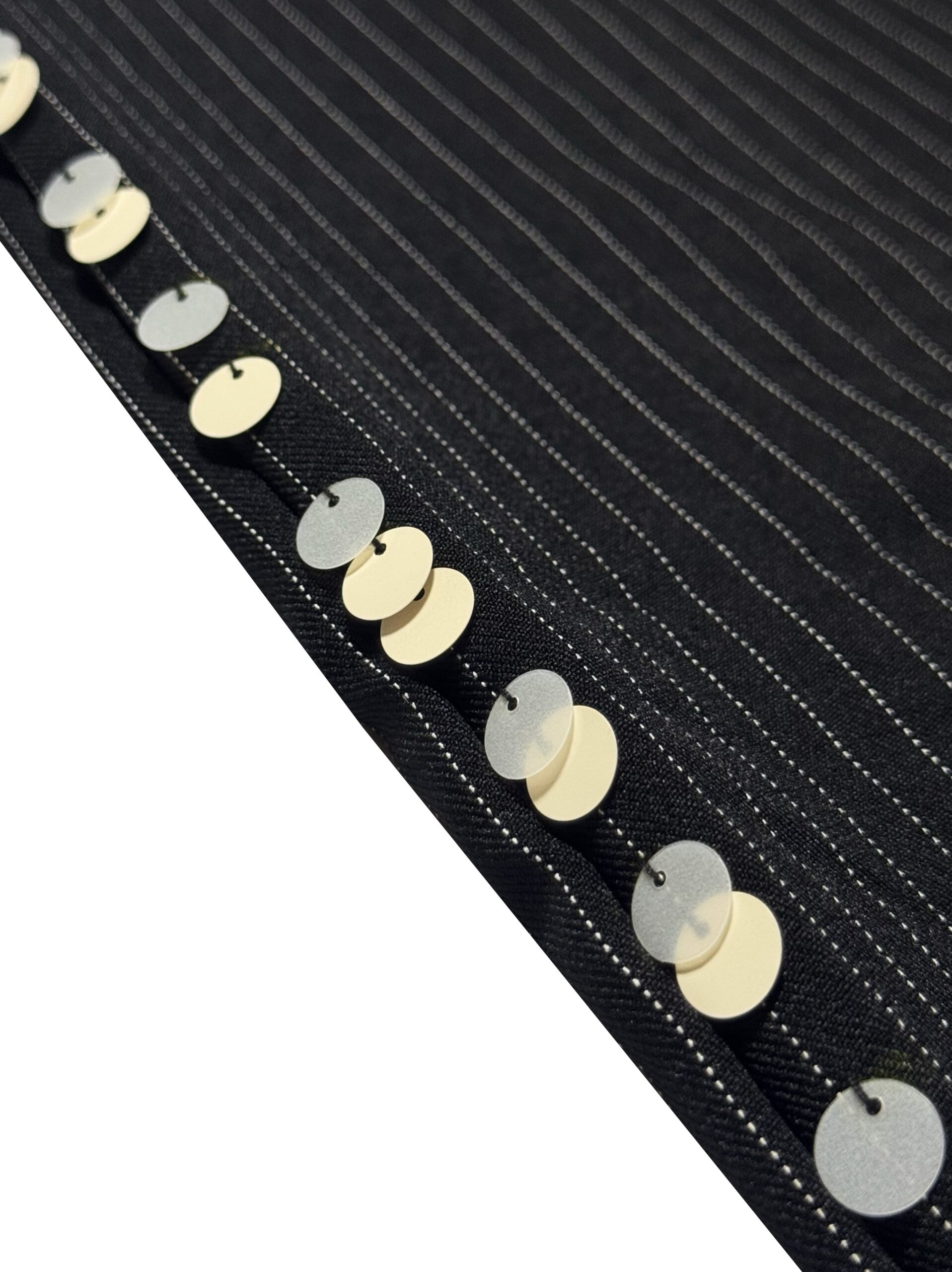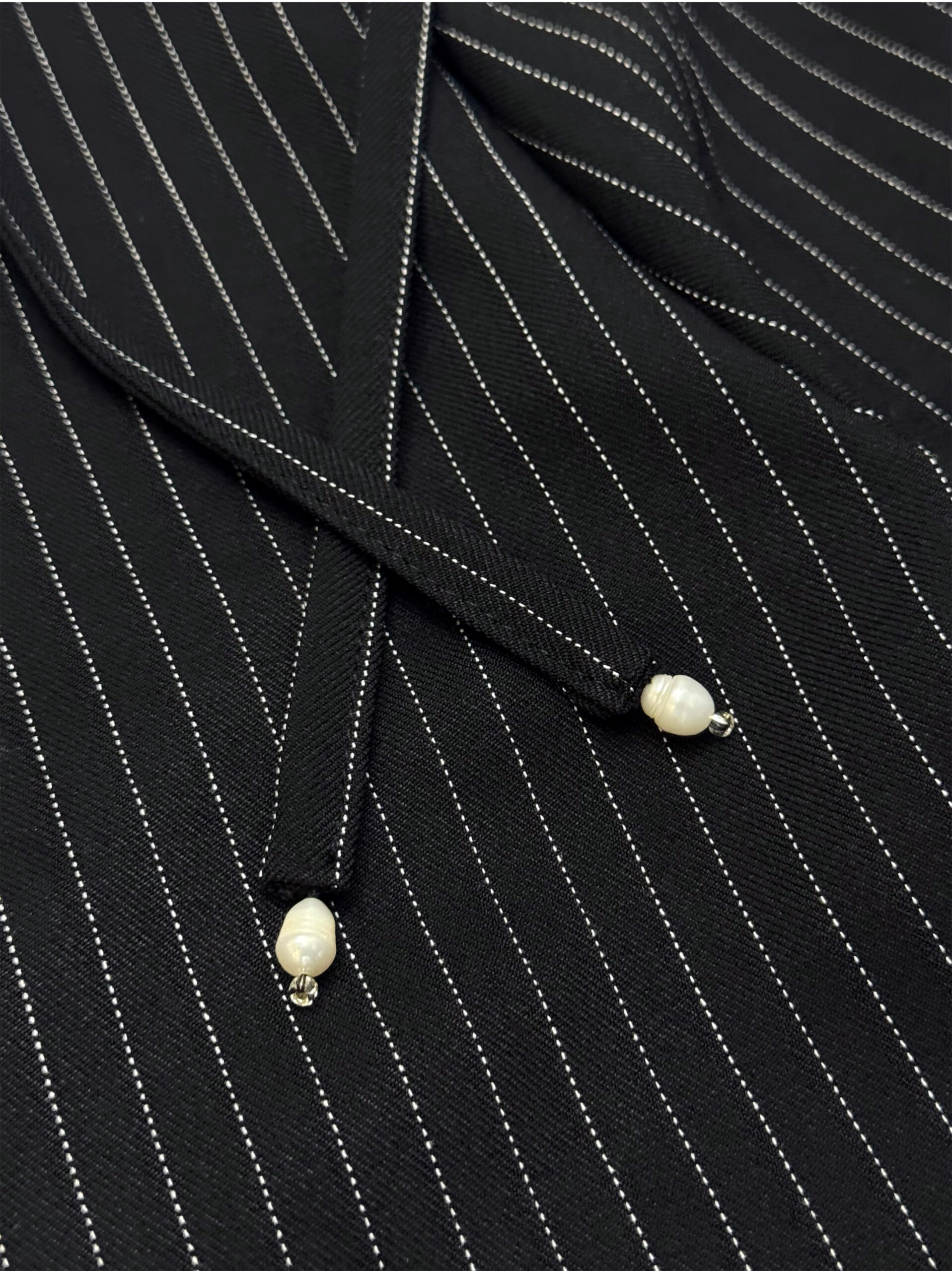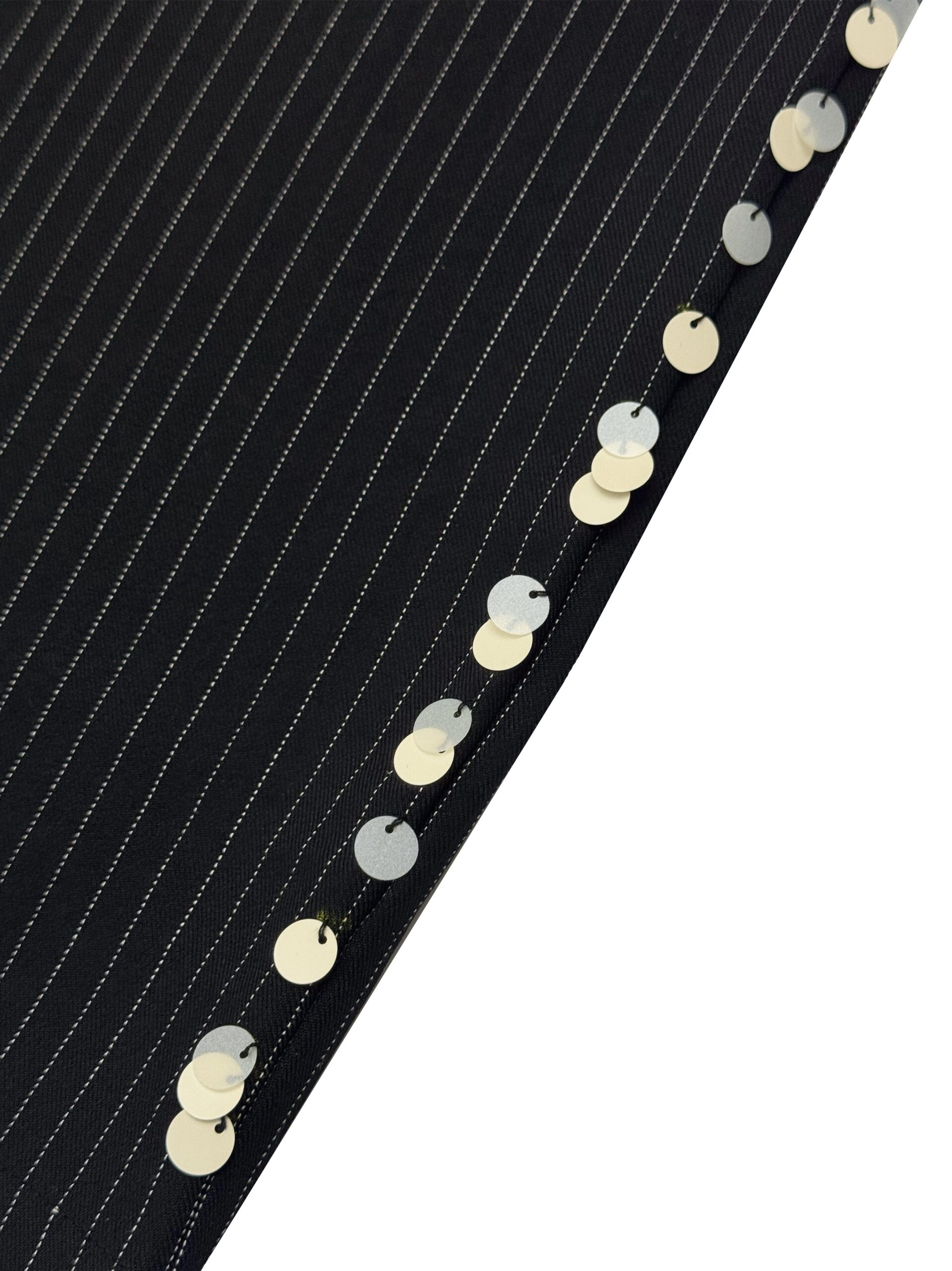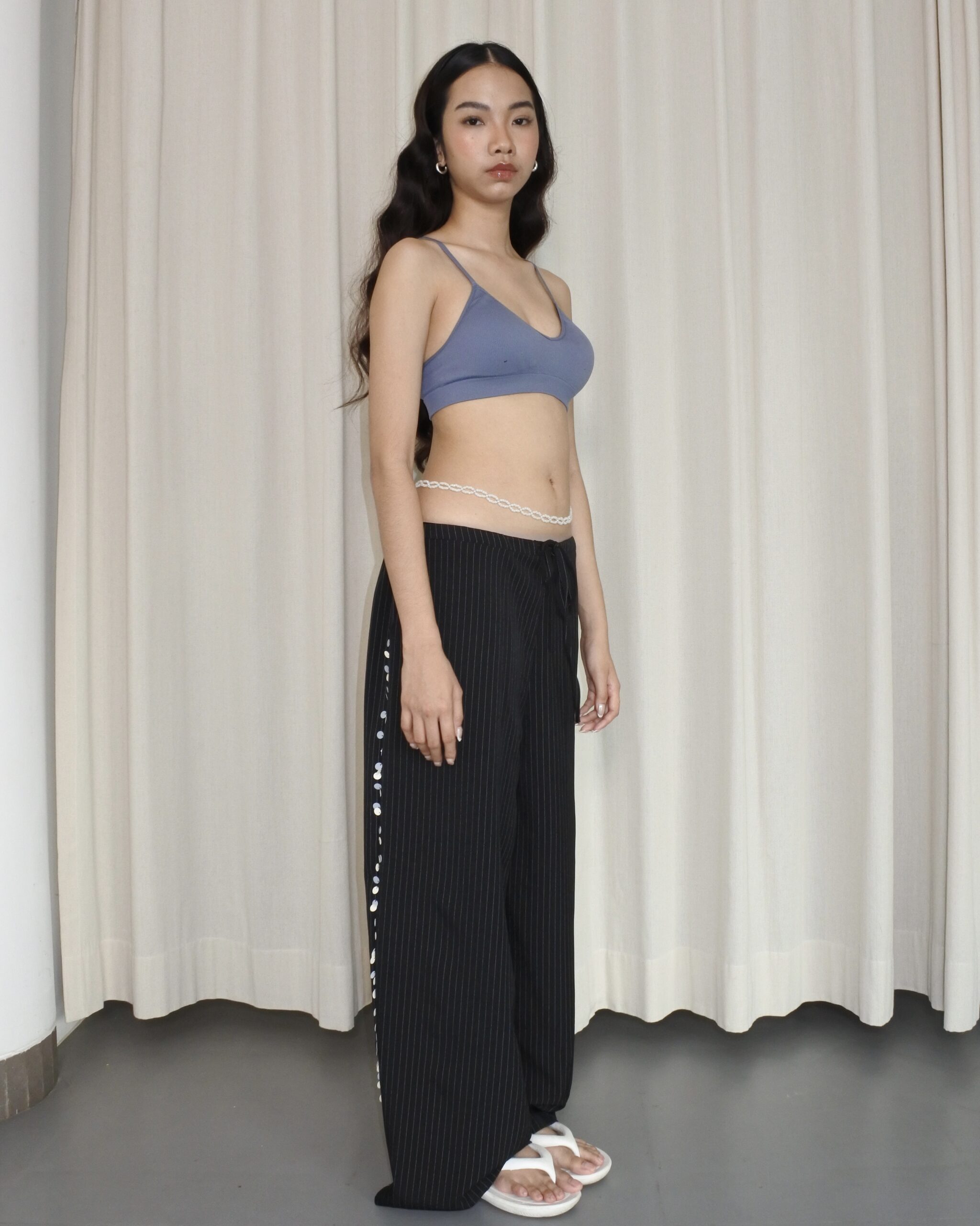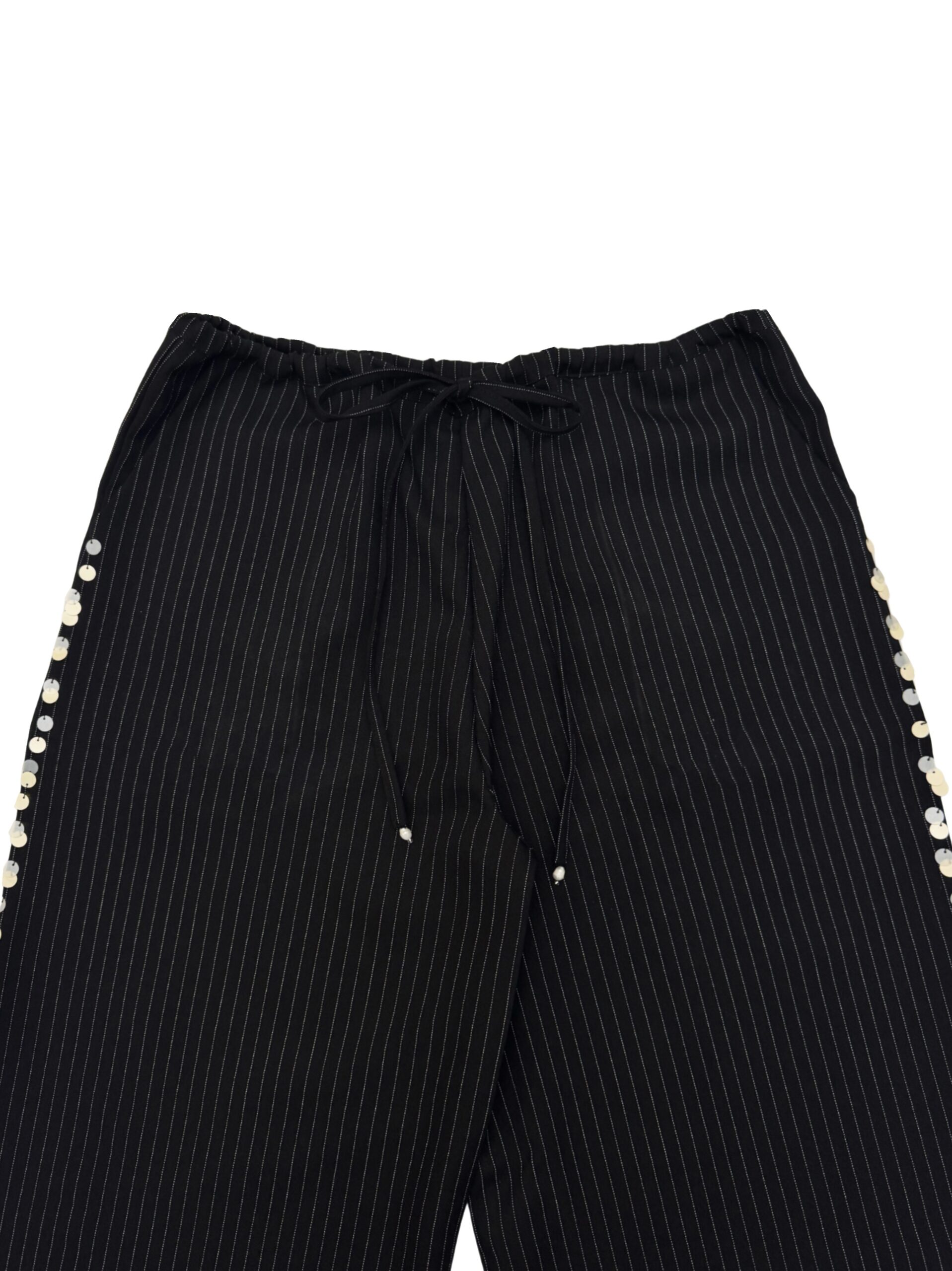 Loose-cut pants with double front & back pockets made from pinstripe fabric, finished with adjustable waistband and drawstring for comfort, made in unisex fitting. Adorned with hand-embellished minimalist sequin details on the sides.