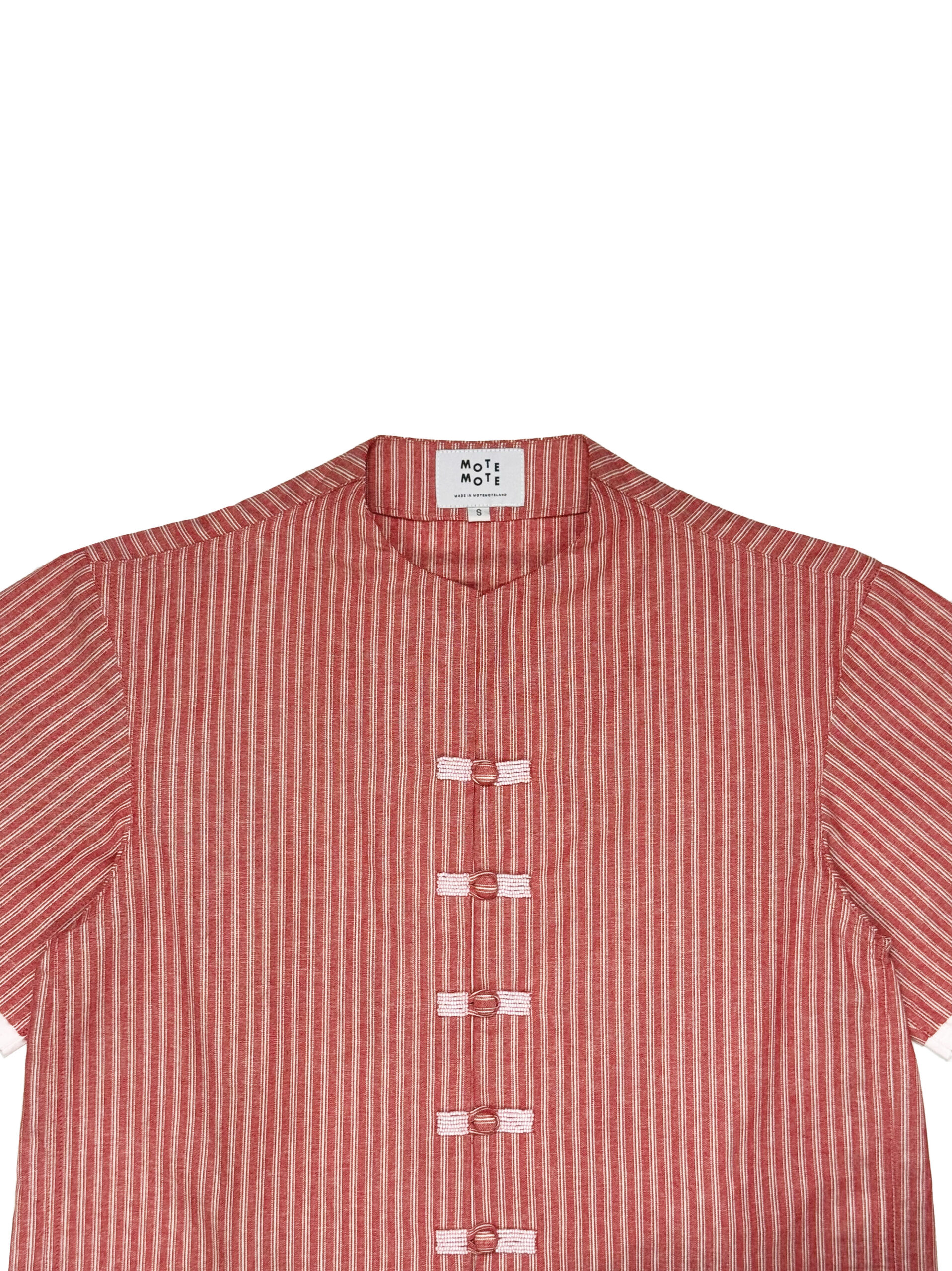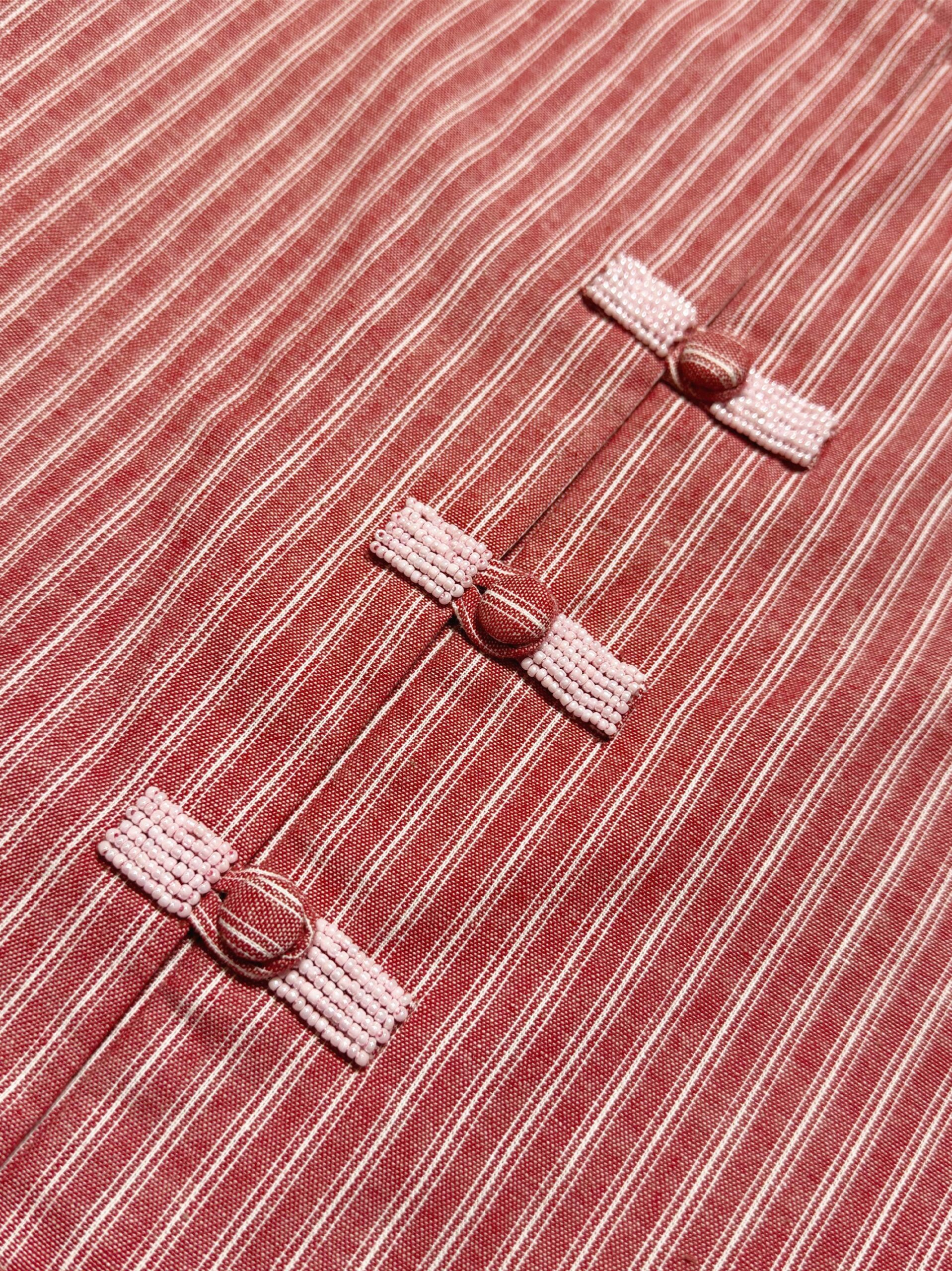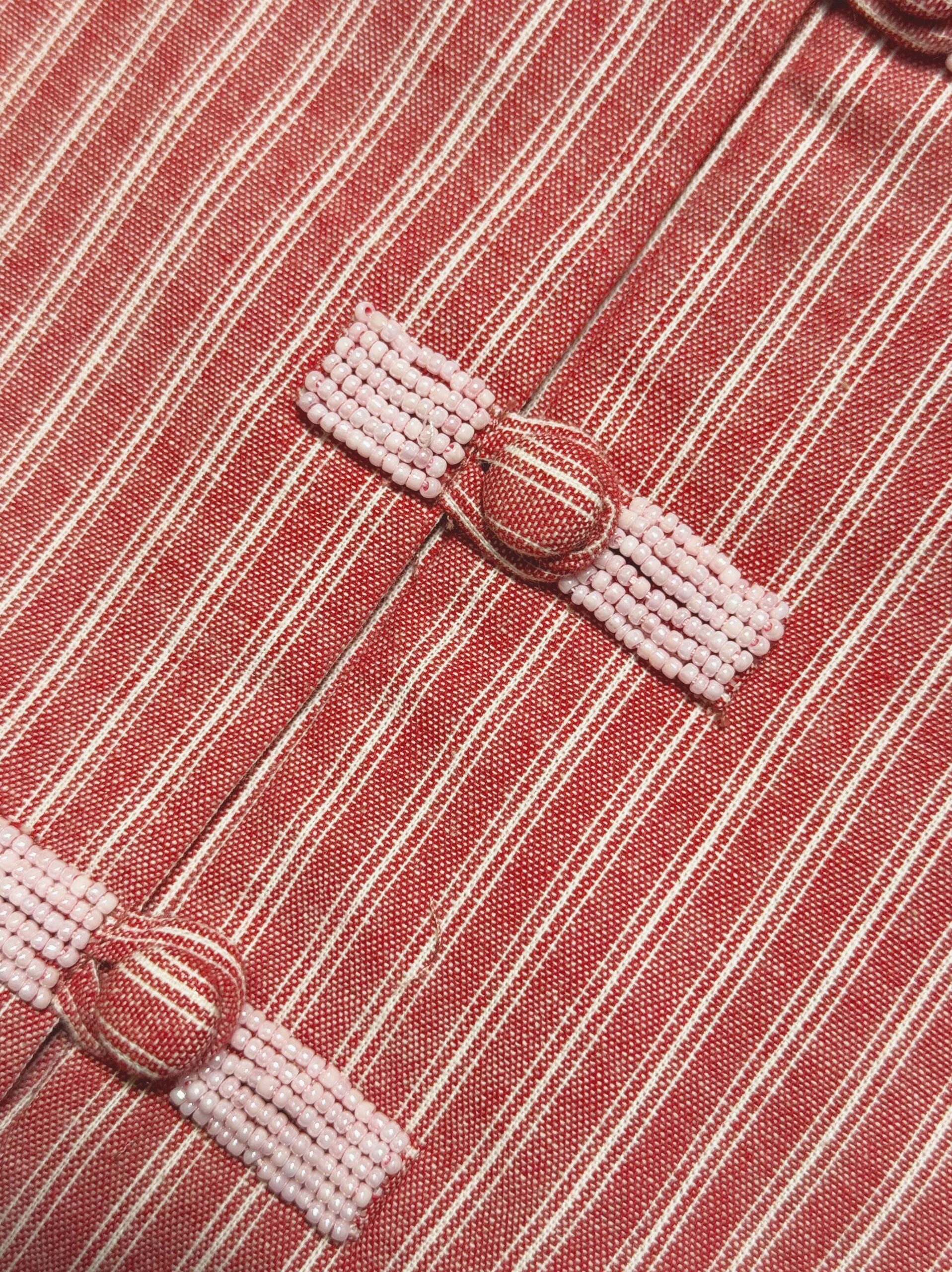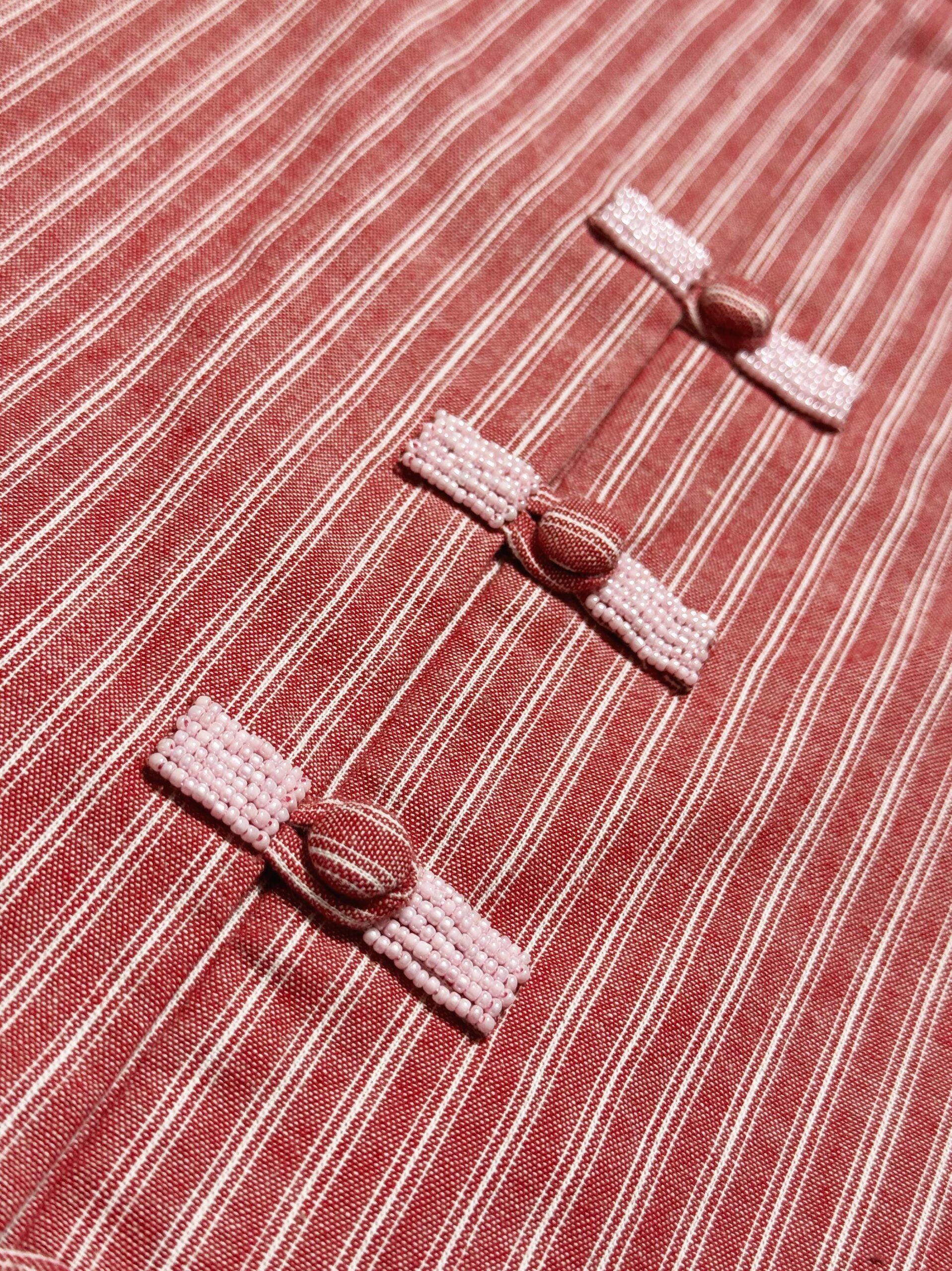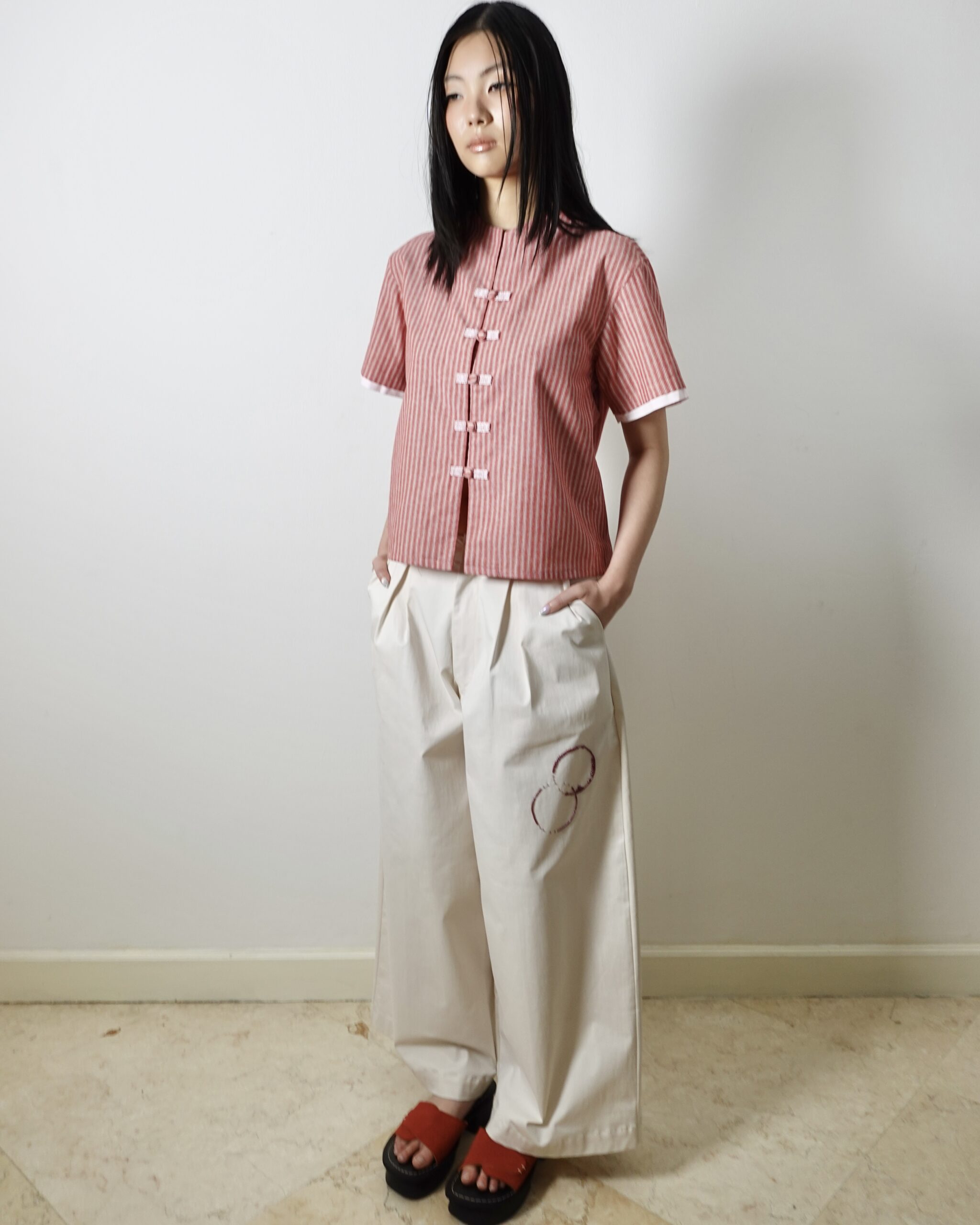 A cropped Boxy-cut shirt featuring reimagined Chinese hand-fastened knot buttoning details with beads decorations on the front, finished with adjustable waist strap for comfort.