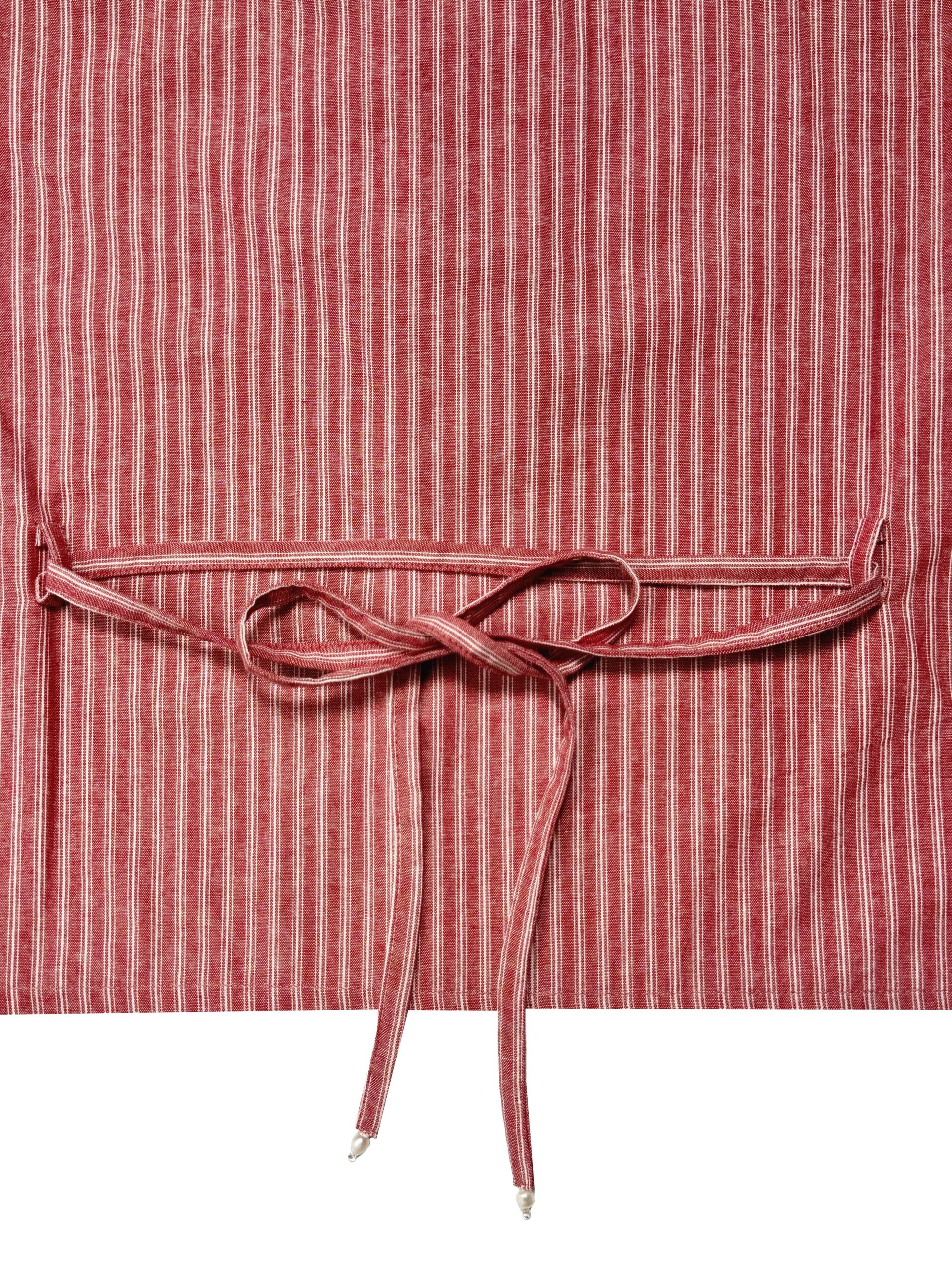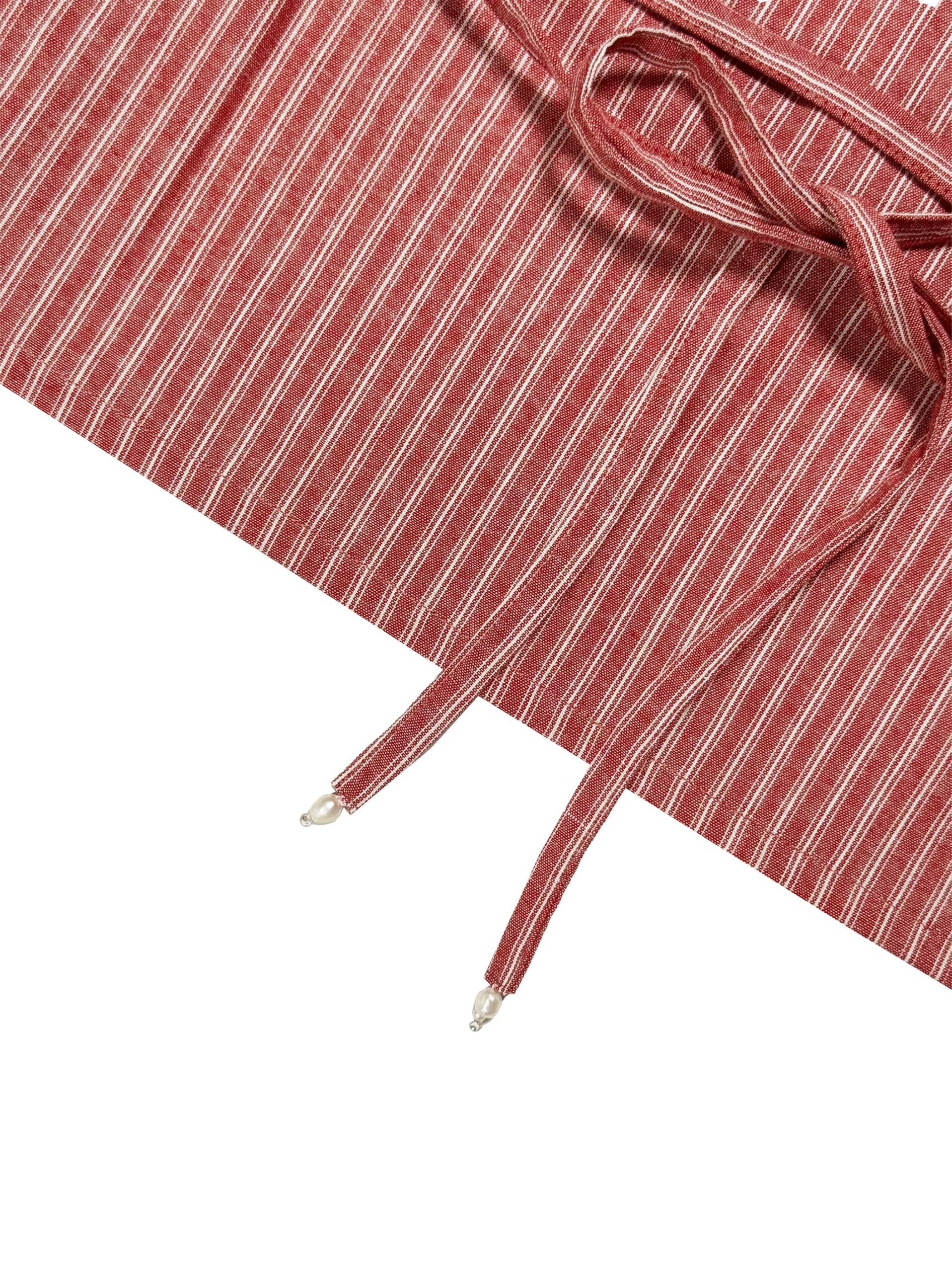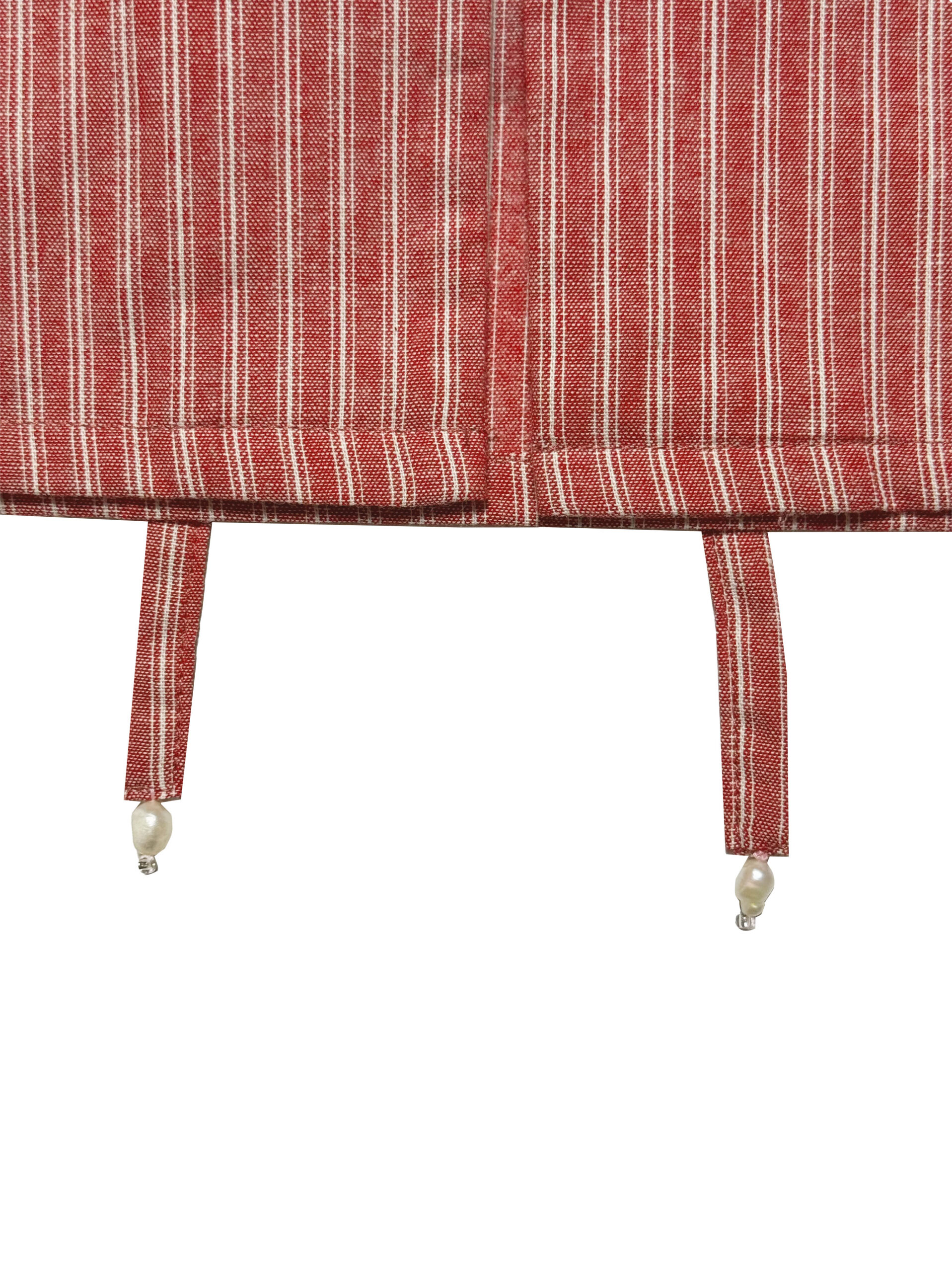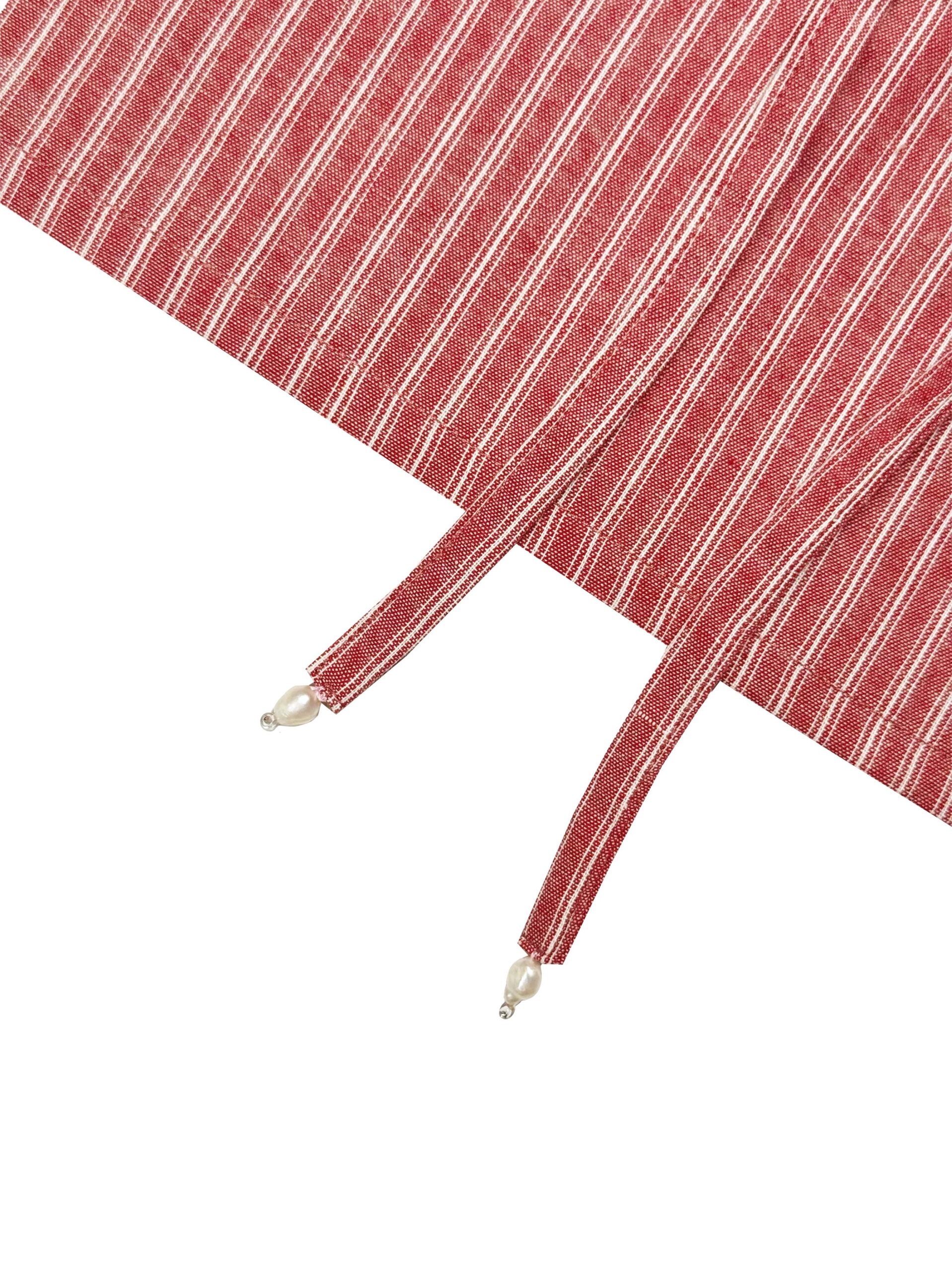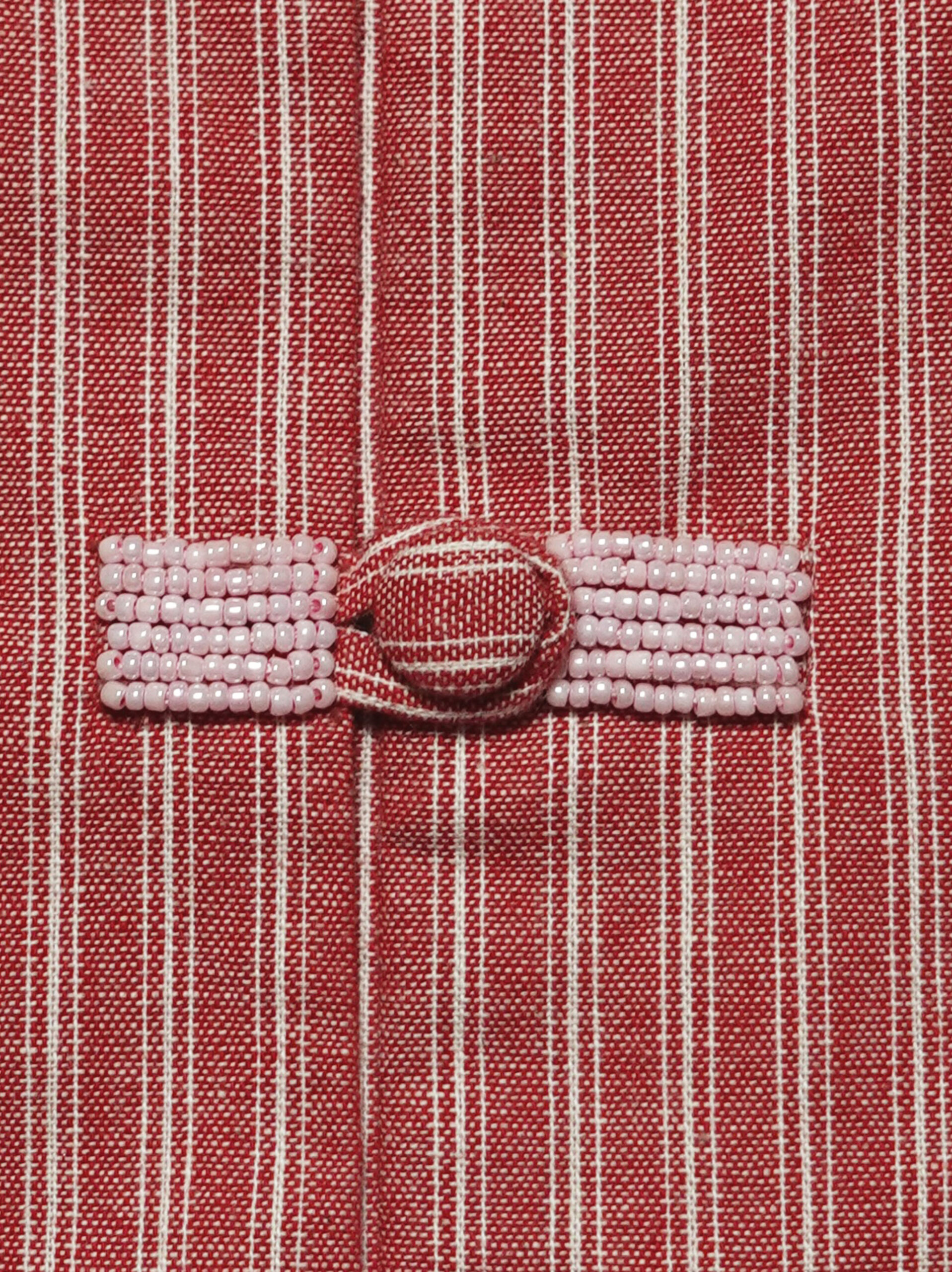 A cropped Boxy-cut shirt featuring reimagined Chinese hand-fastened knot buttoning details with beads decorations on the front, finished with adjustable waist strap for comfort.