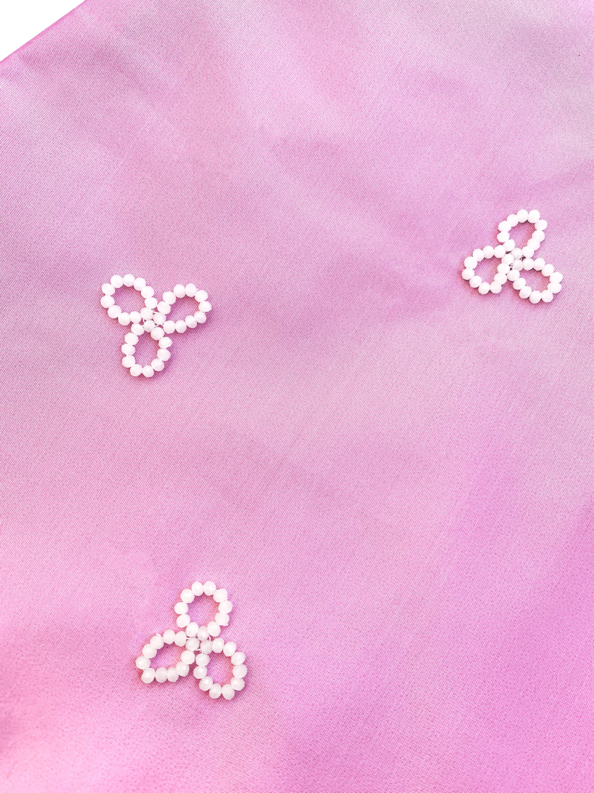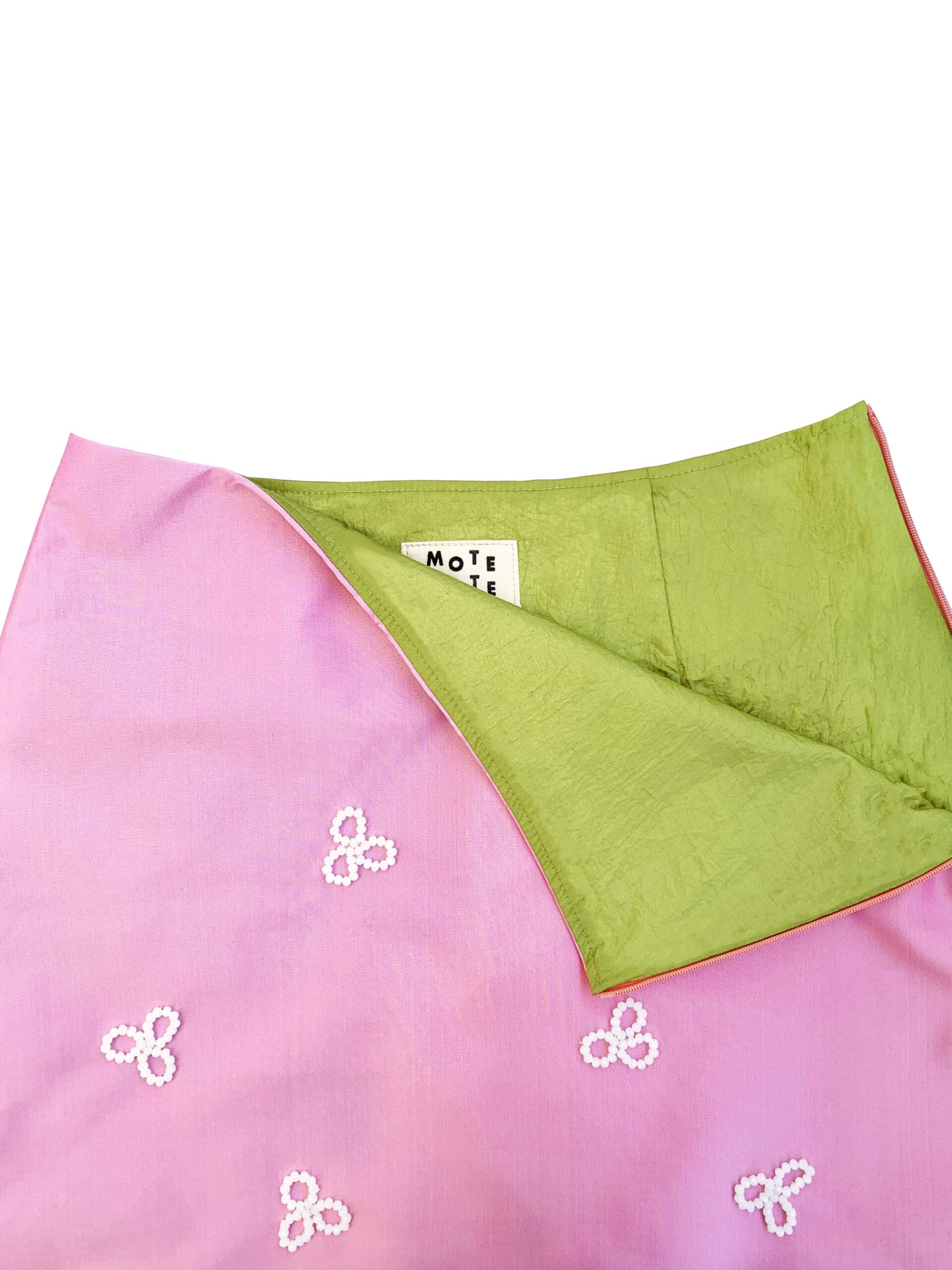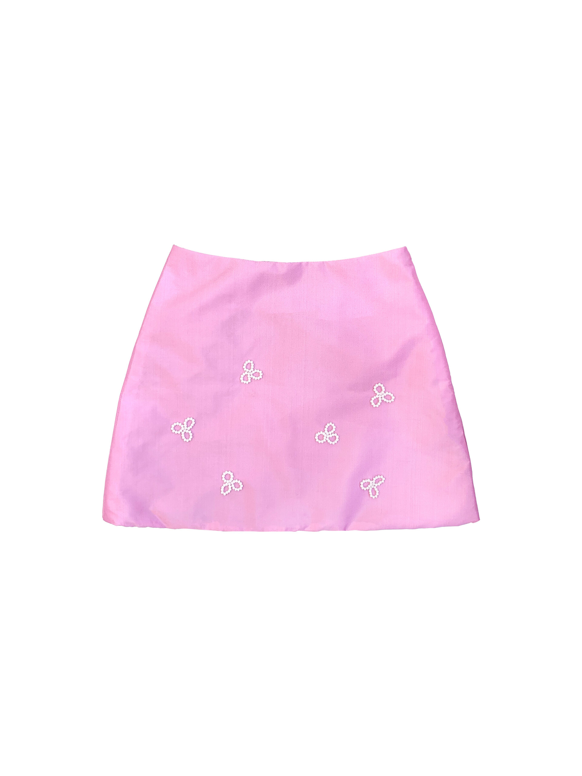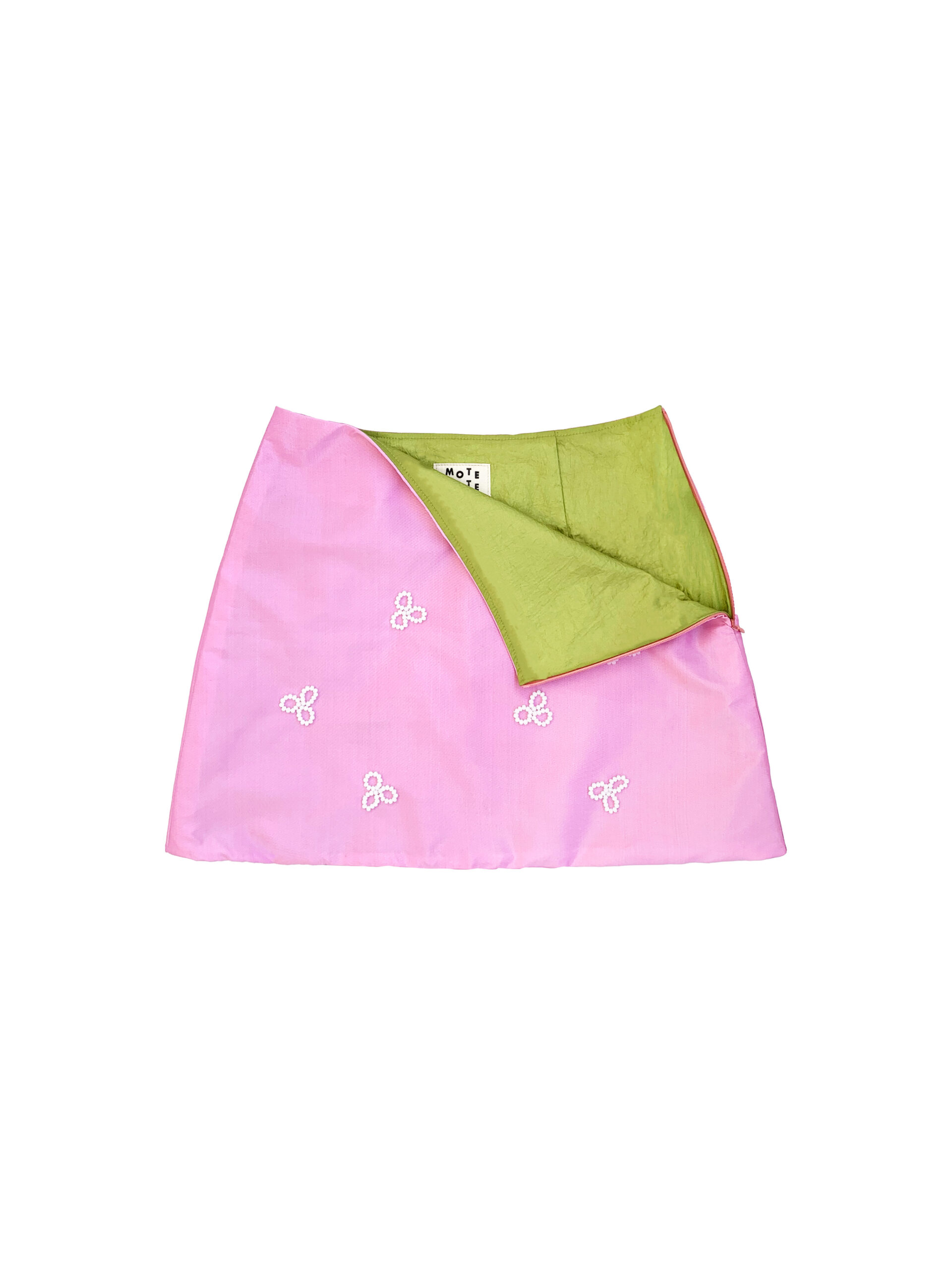 Mote Mote’s new take on mini skirts! Featuring hand-crafted flower petal embellishments made of glass and ceramic beads, finished with side-zip opening, straight hem and interlining.