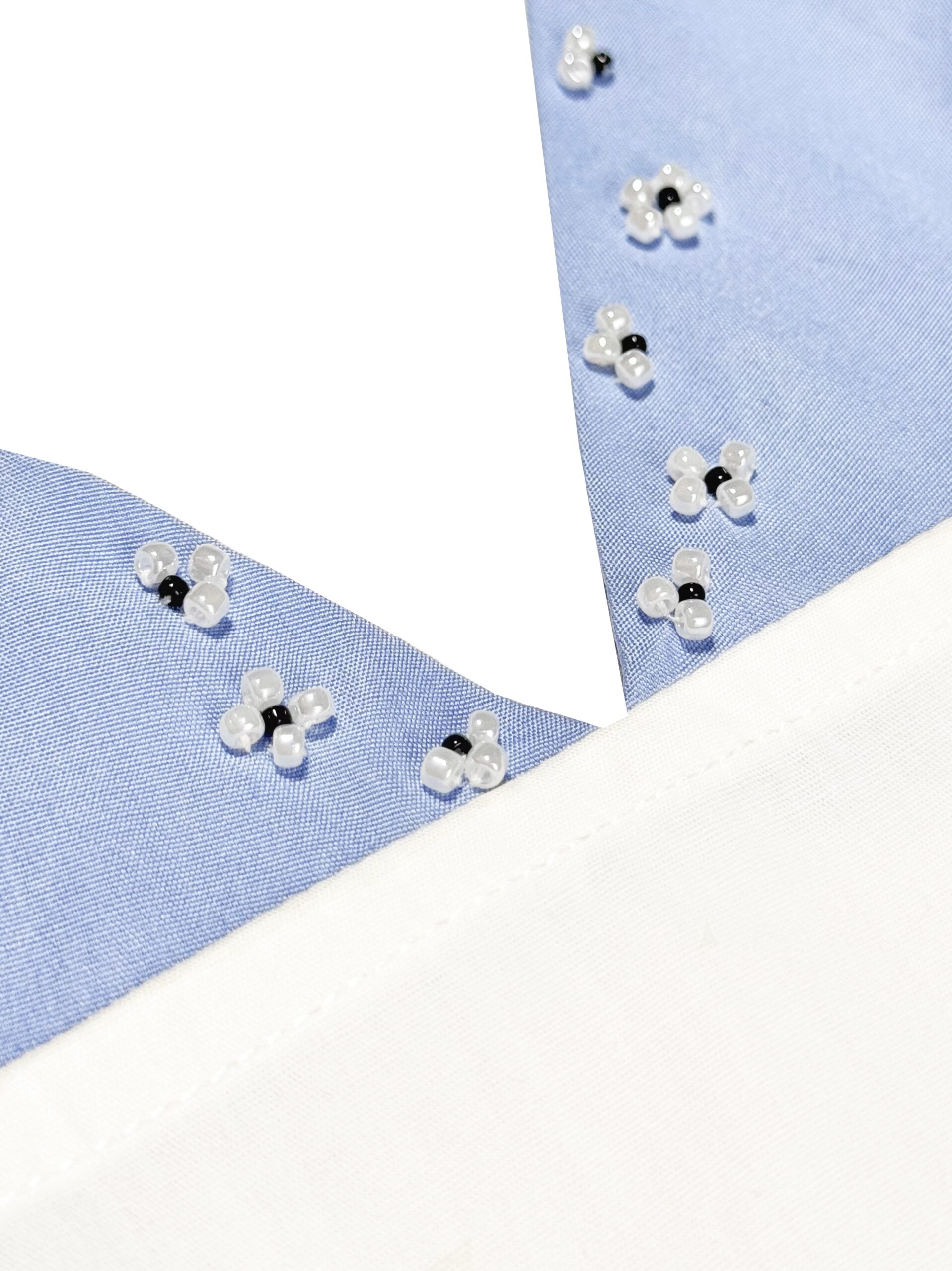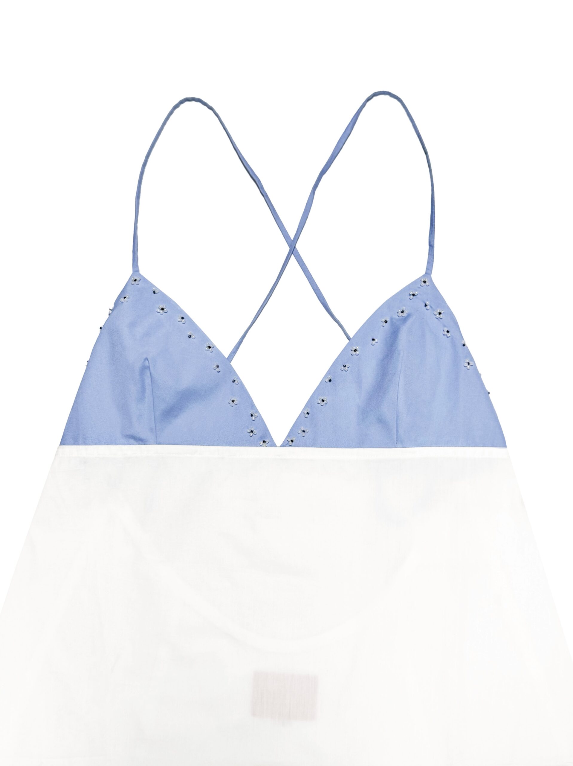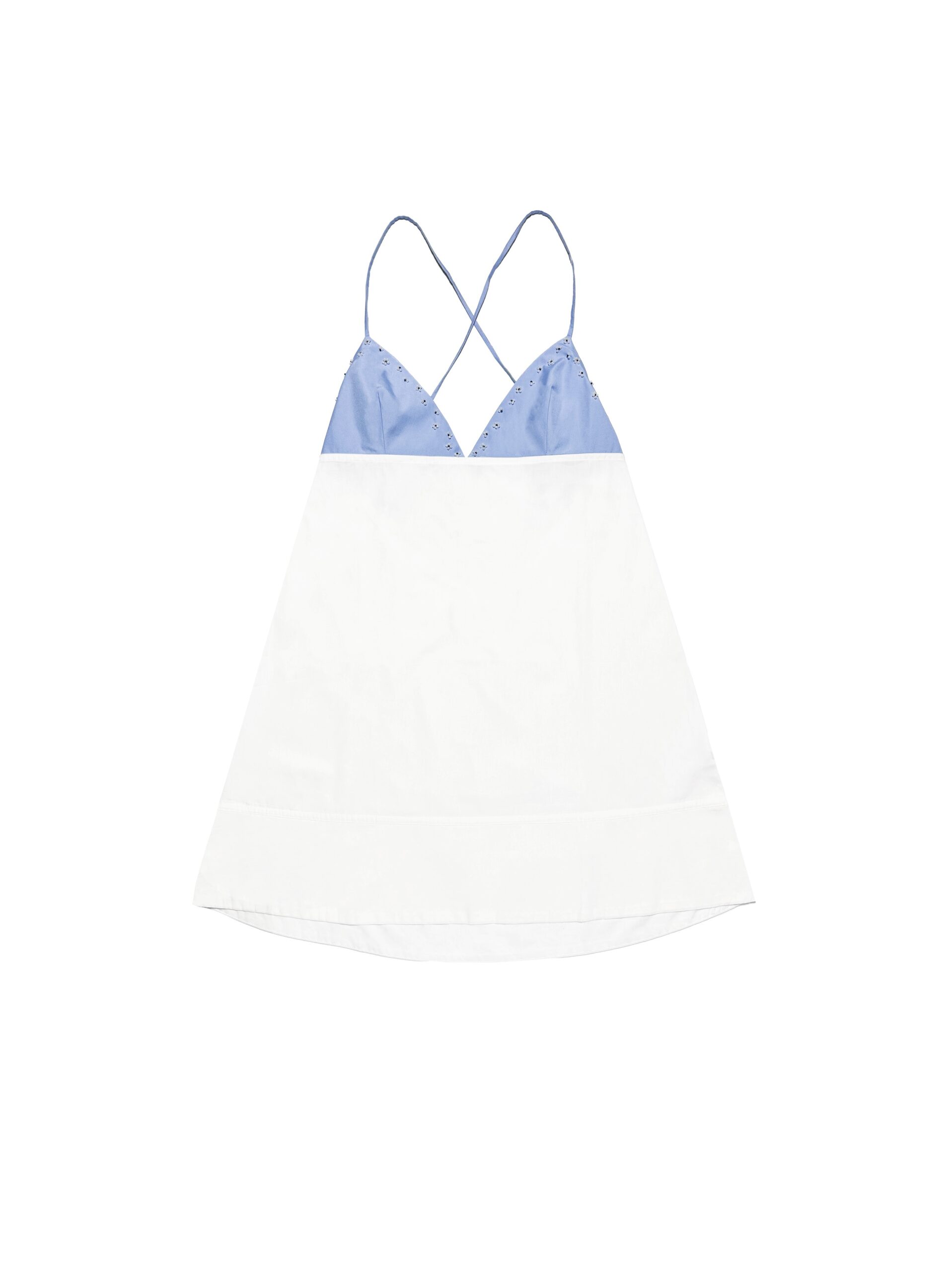 Very first silhouette of Mote Mote’s sleek mini dress featuring airy flared silhouette with minimalist design of hand-beaded embellishments for subtle pop, constructed in two-tone poplin fabrications with low-cut neckline and crossover back finished with adjustable straps for extra comfort.