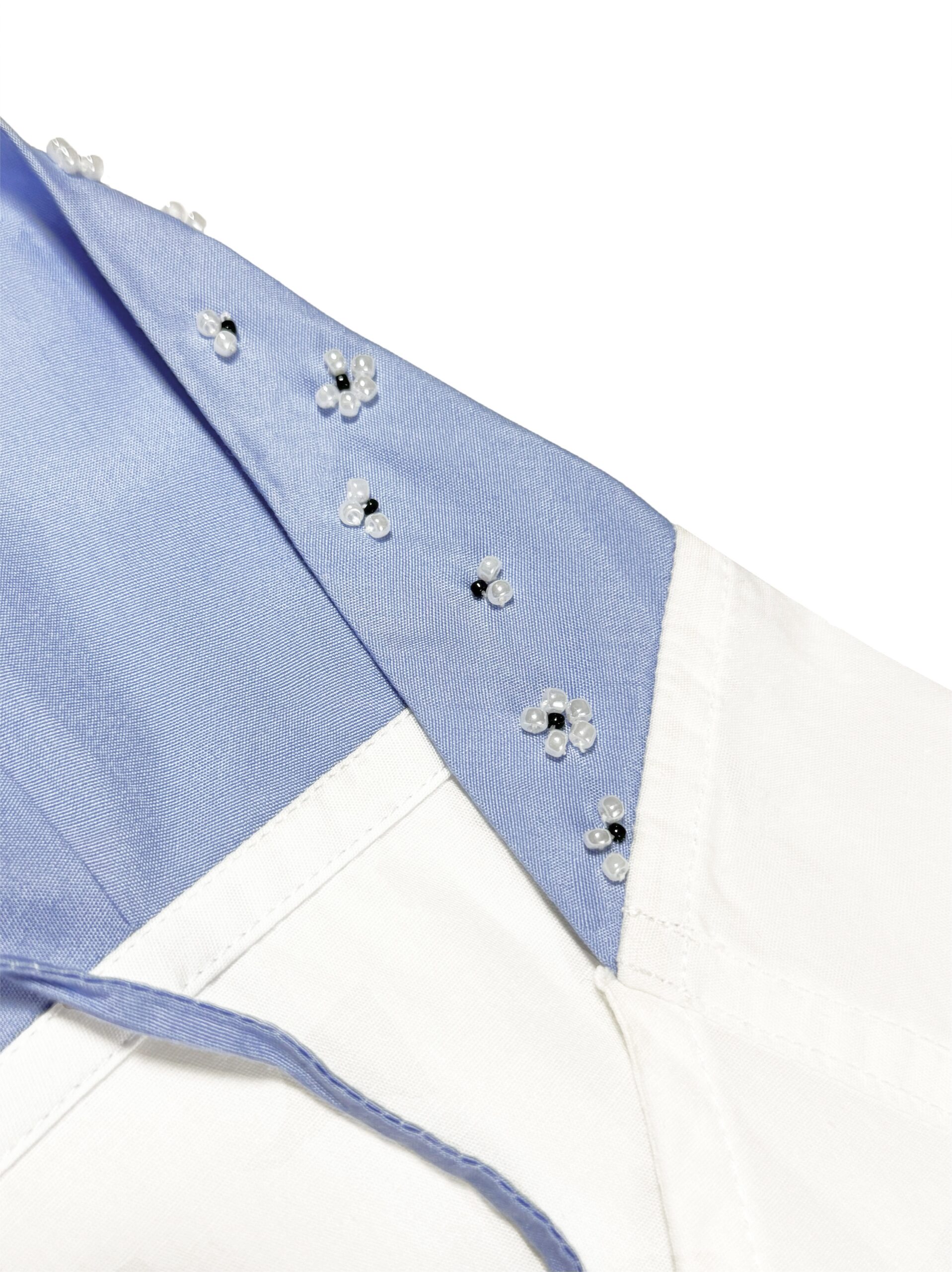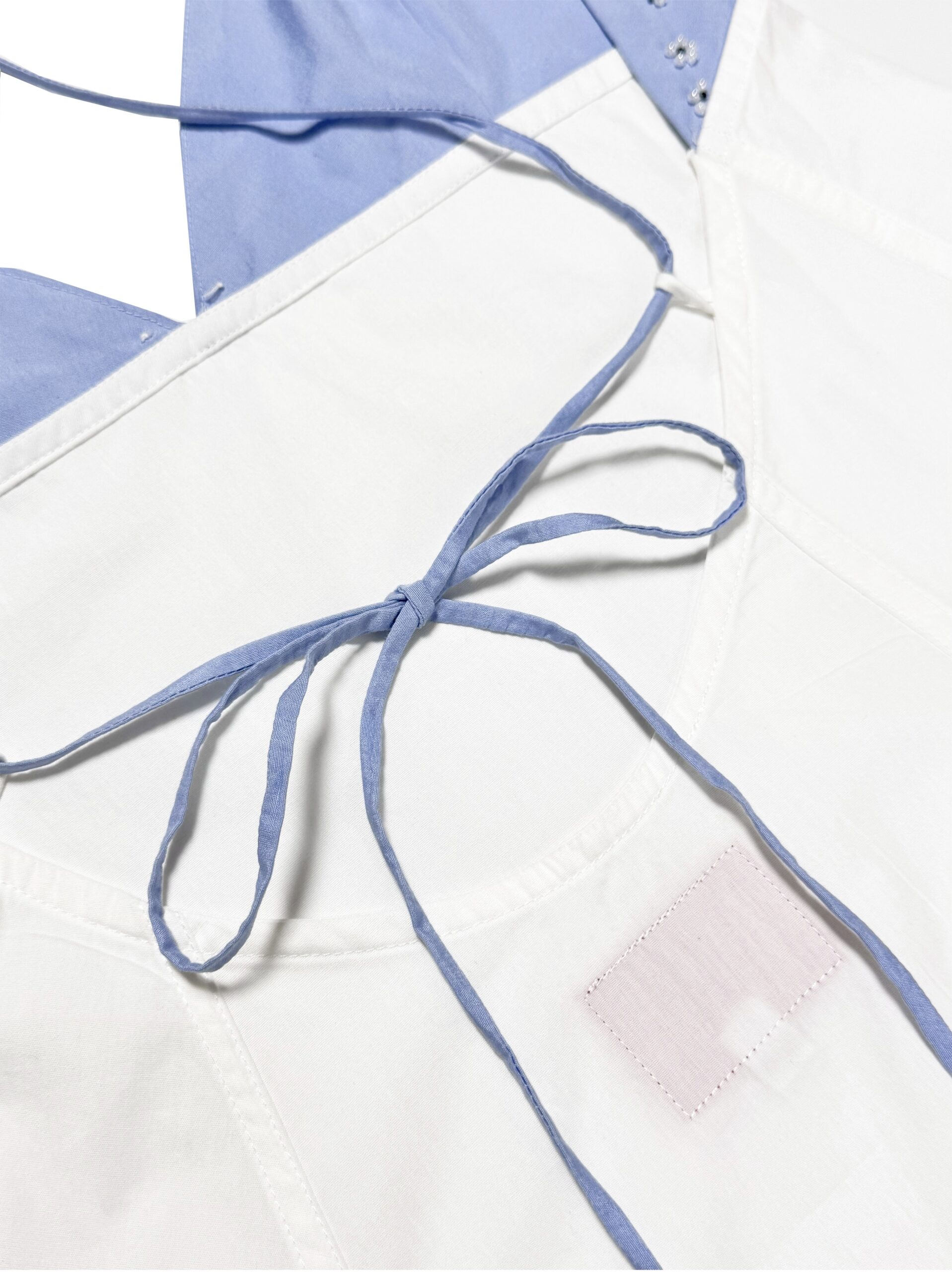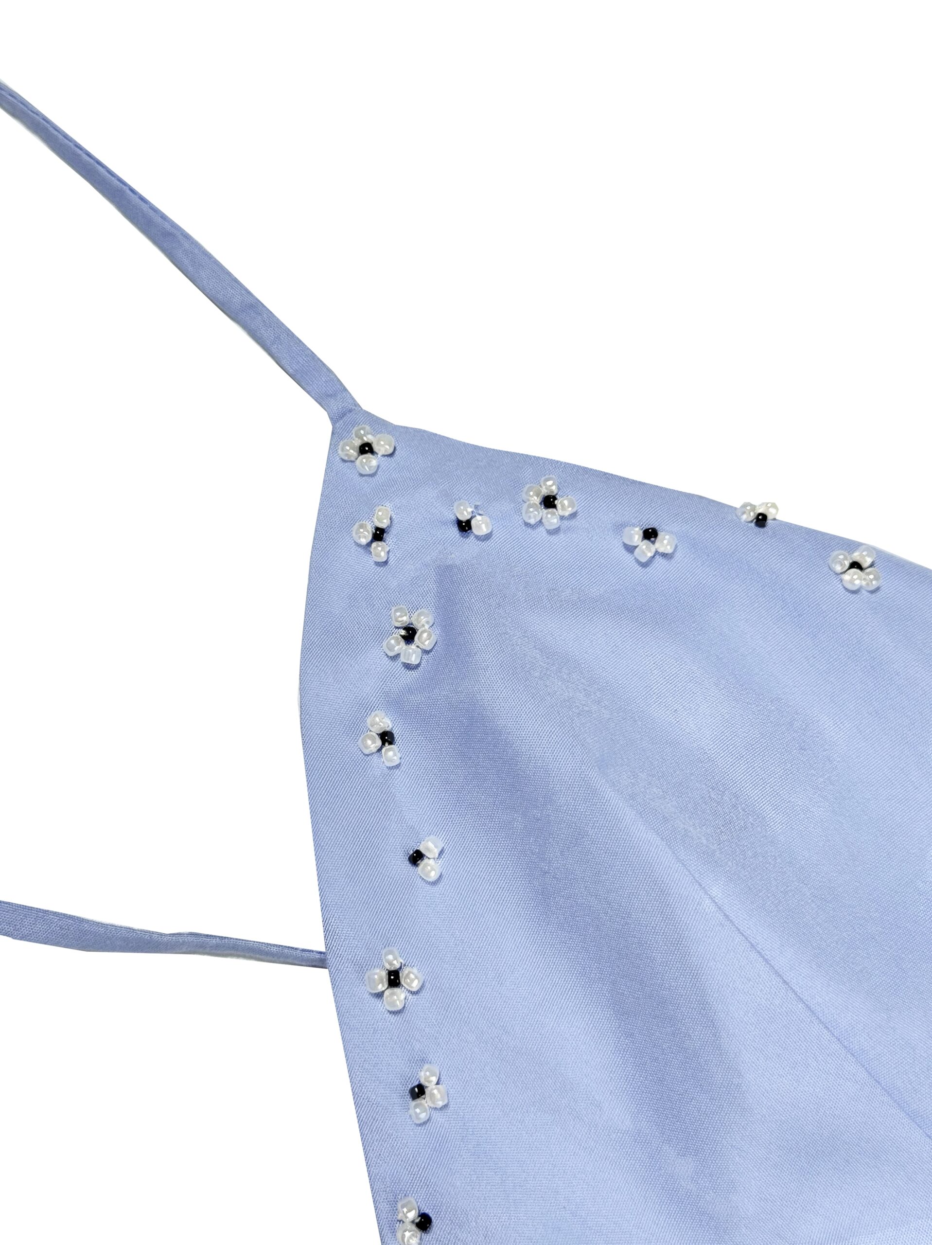 Very first silhouette of Mote Mote’s sleek mini dress featuring airy flared silhouette with minimalist design of hand-beaded embellishments for subtle pop, constructed in two-tone poplin fabrications with low-cut neckline and crossover back finished with adjustable straps for extra comfort.