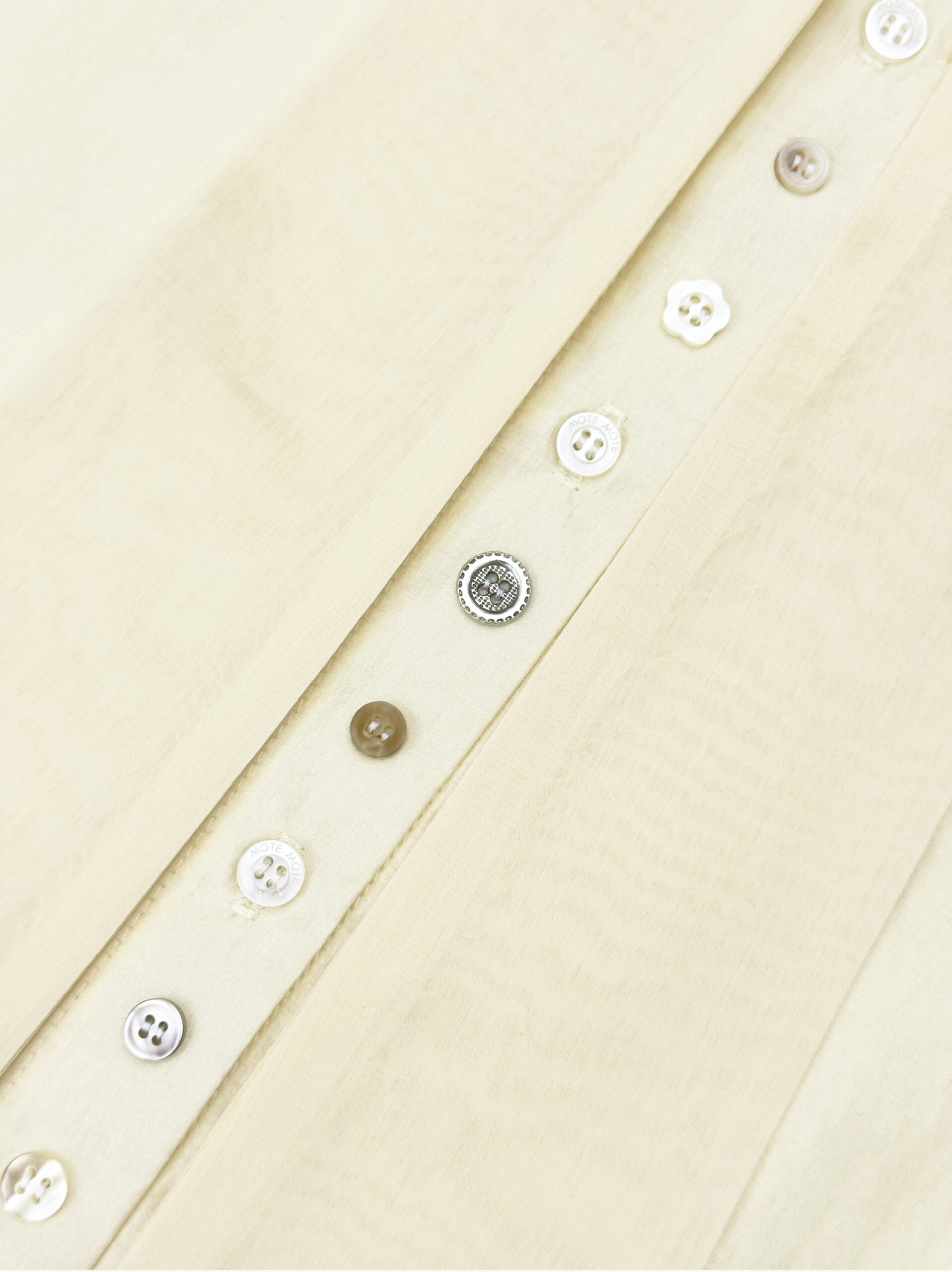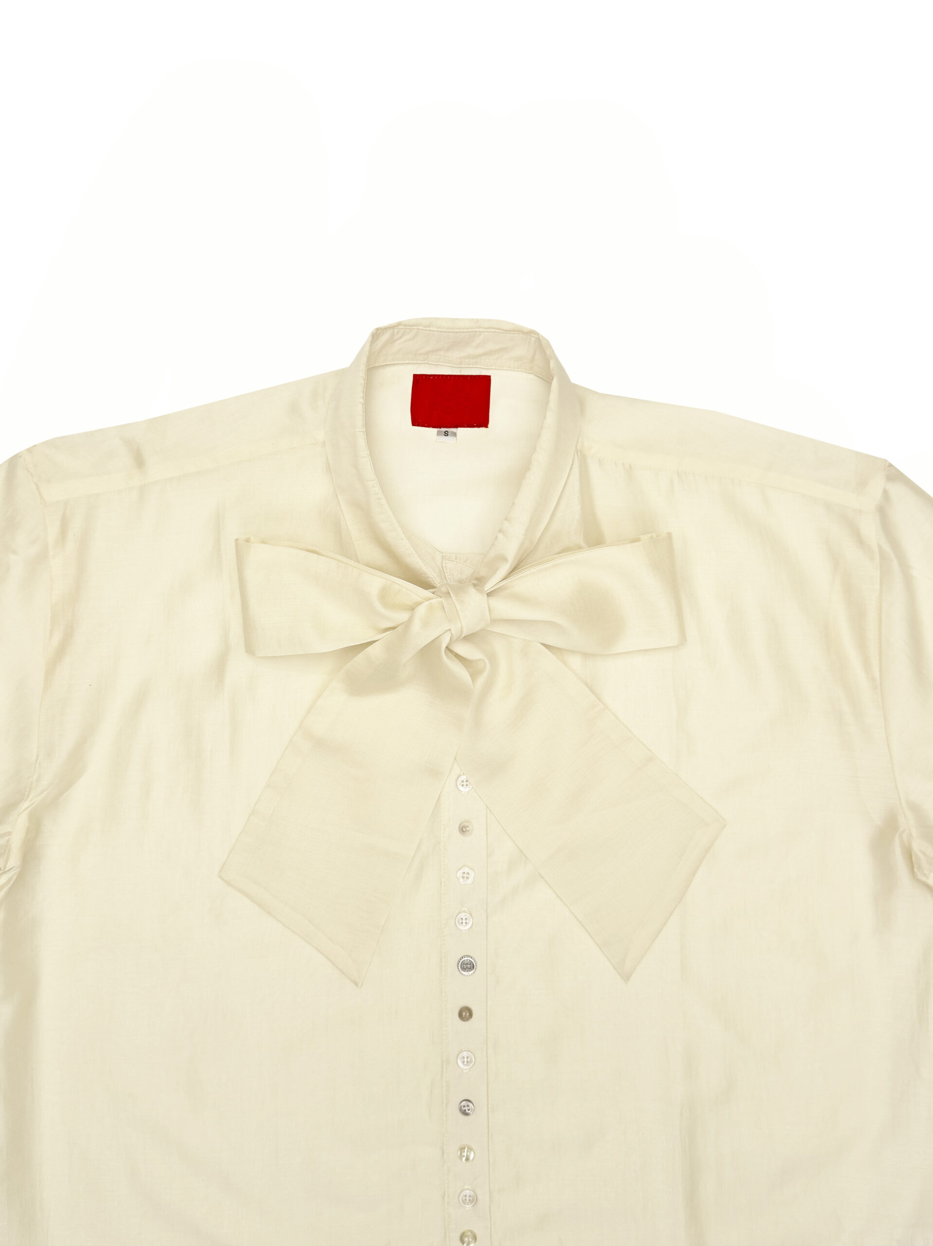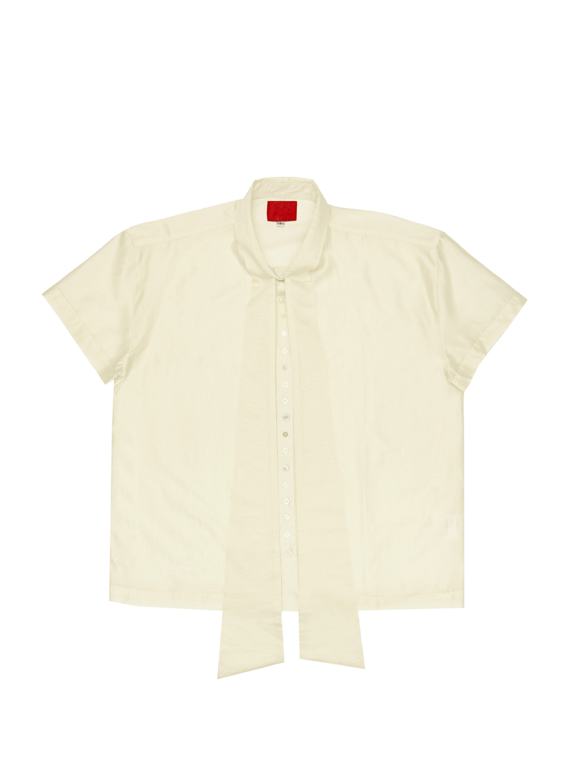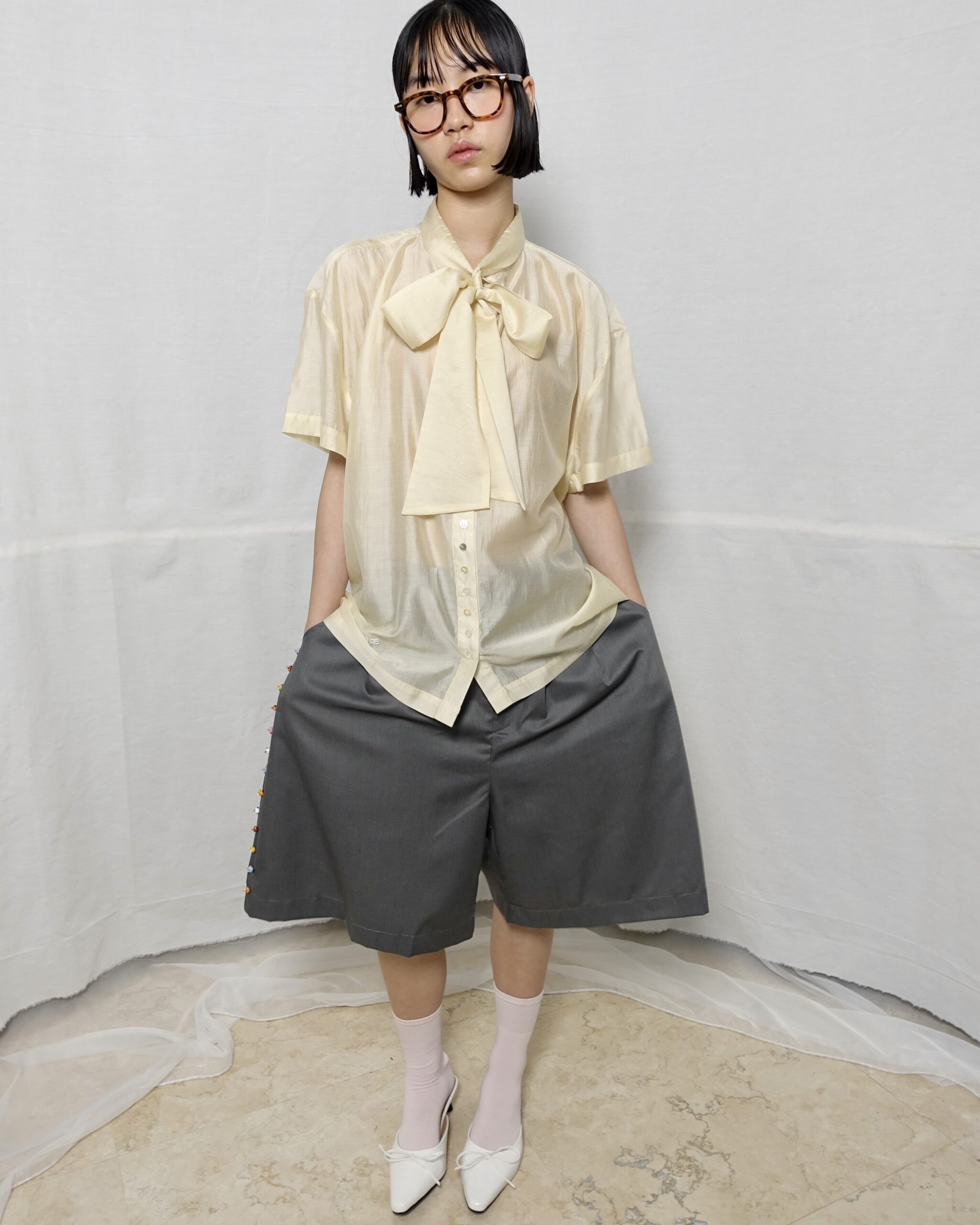 Constructed of poplin fabric, with asymmetric buttoning & bowtie details, made in unisex fitting. Adorned with hand-beaded embellishments on the collar, neatly finished with Mote Mote’s embossed transparent buttons.