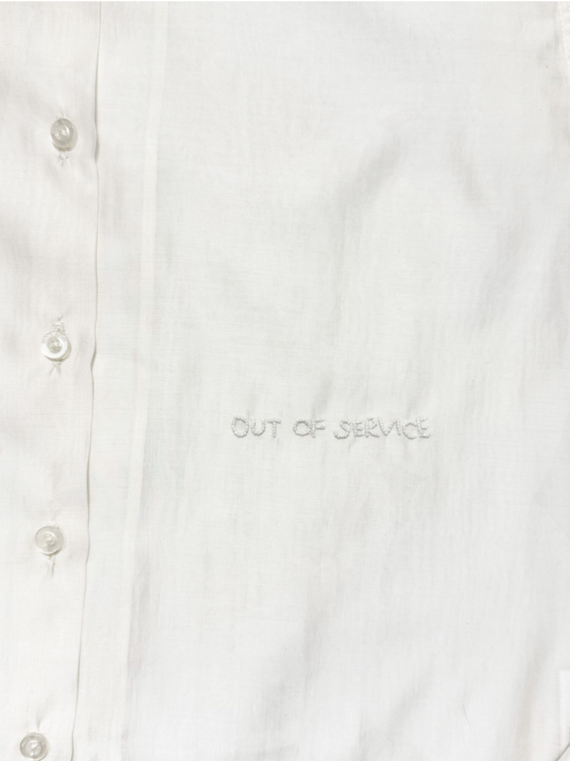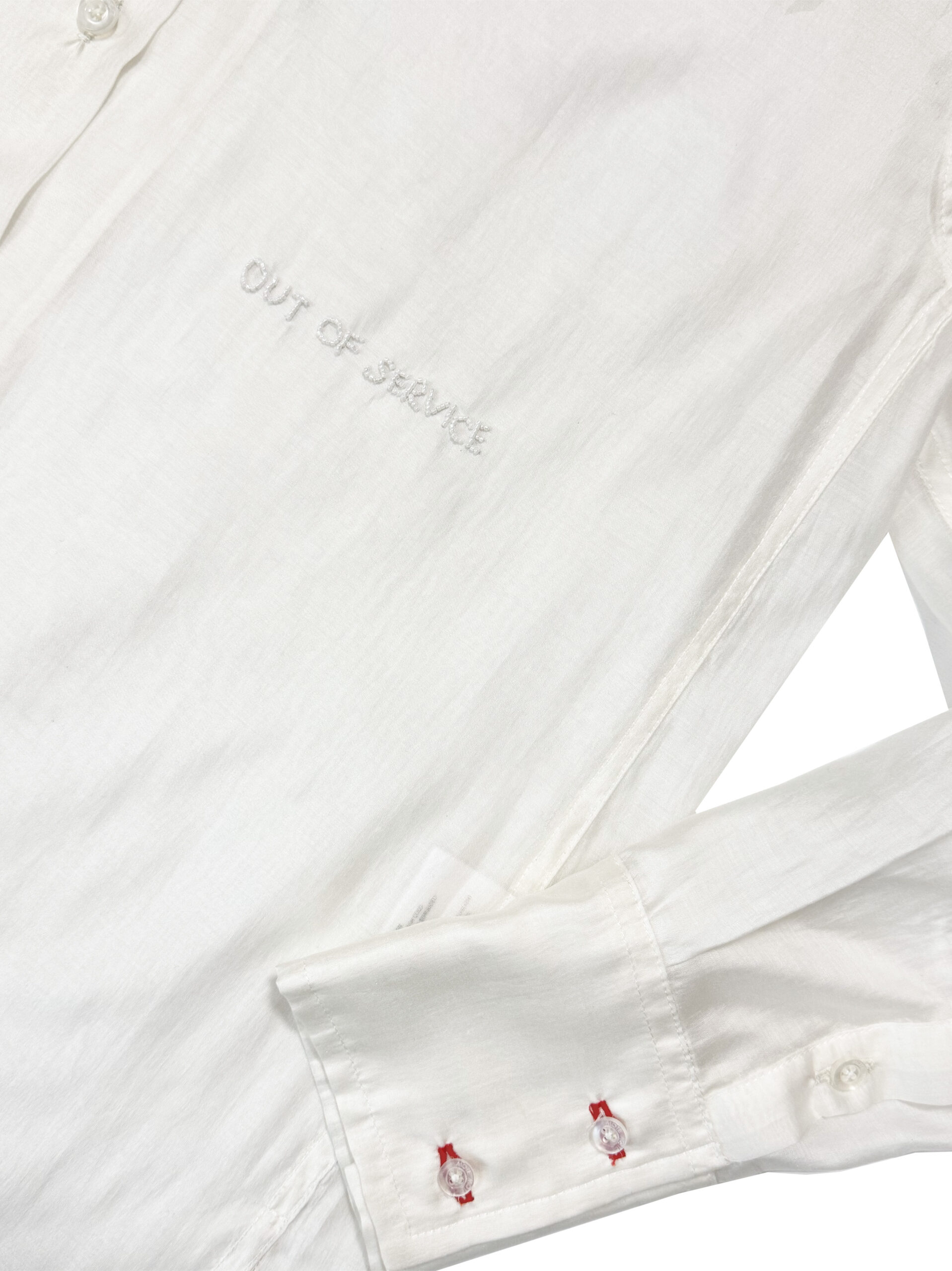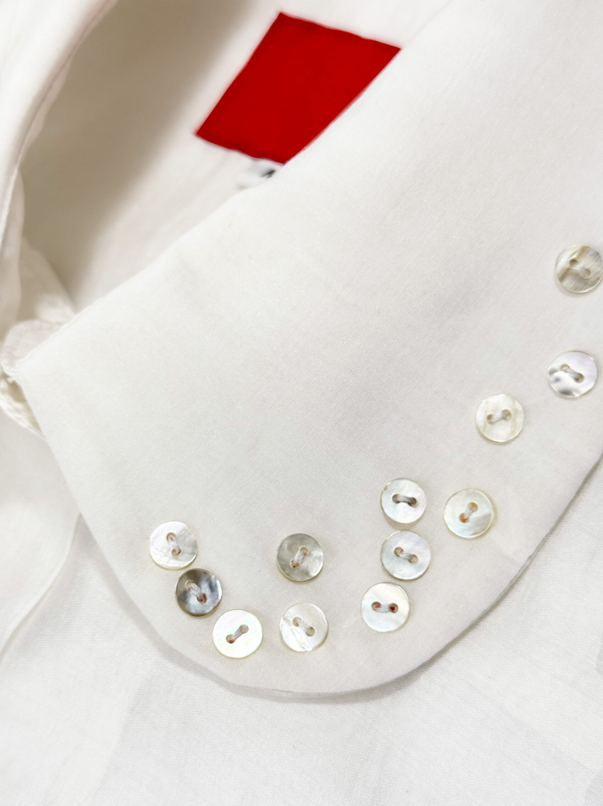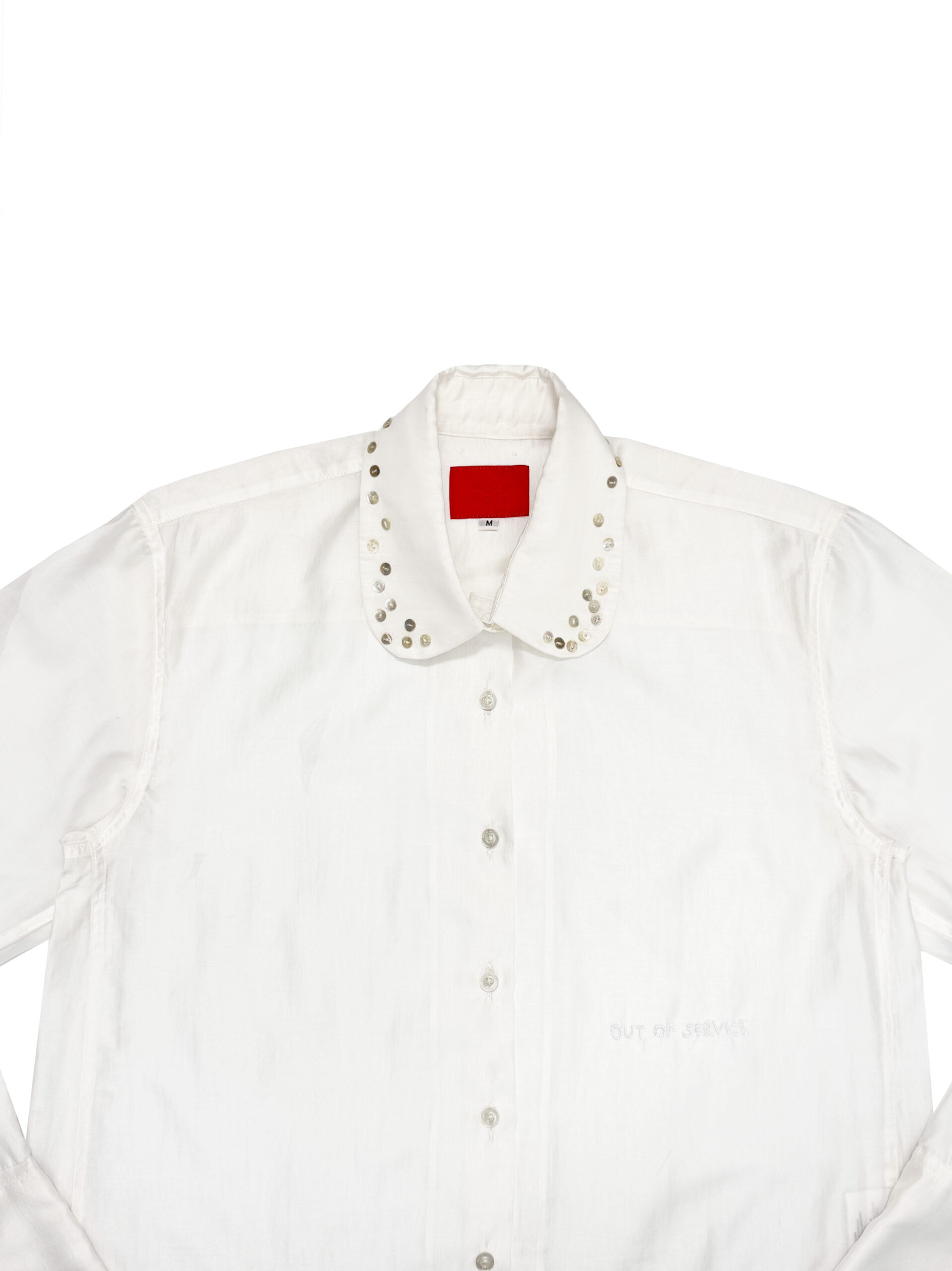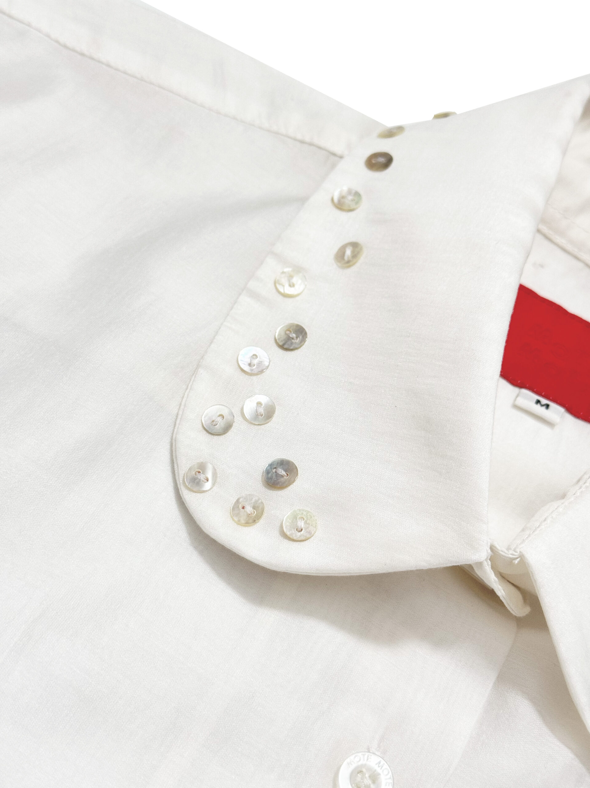 Regular fit shirt with long french cuffed sleeve, matte pearlescent Mote Mote buttons detailing and round beaded collar detailing, made from see-through voal fabric.
