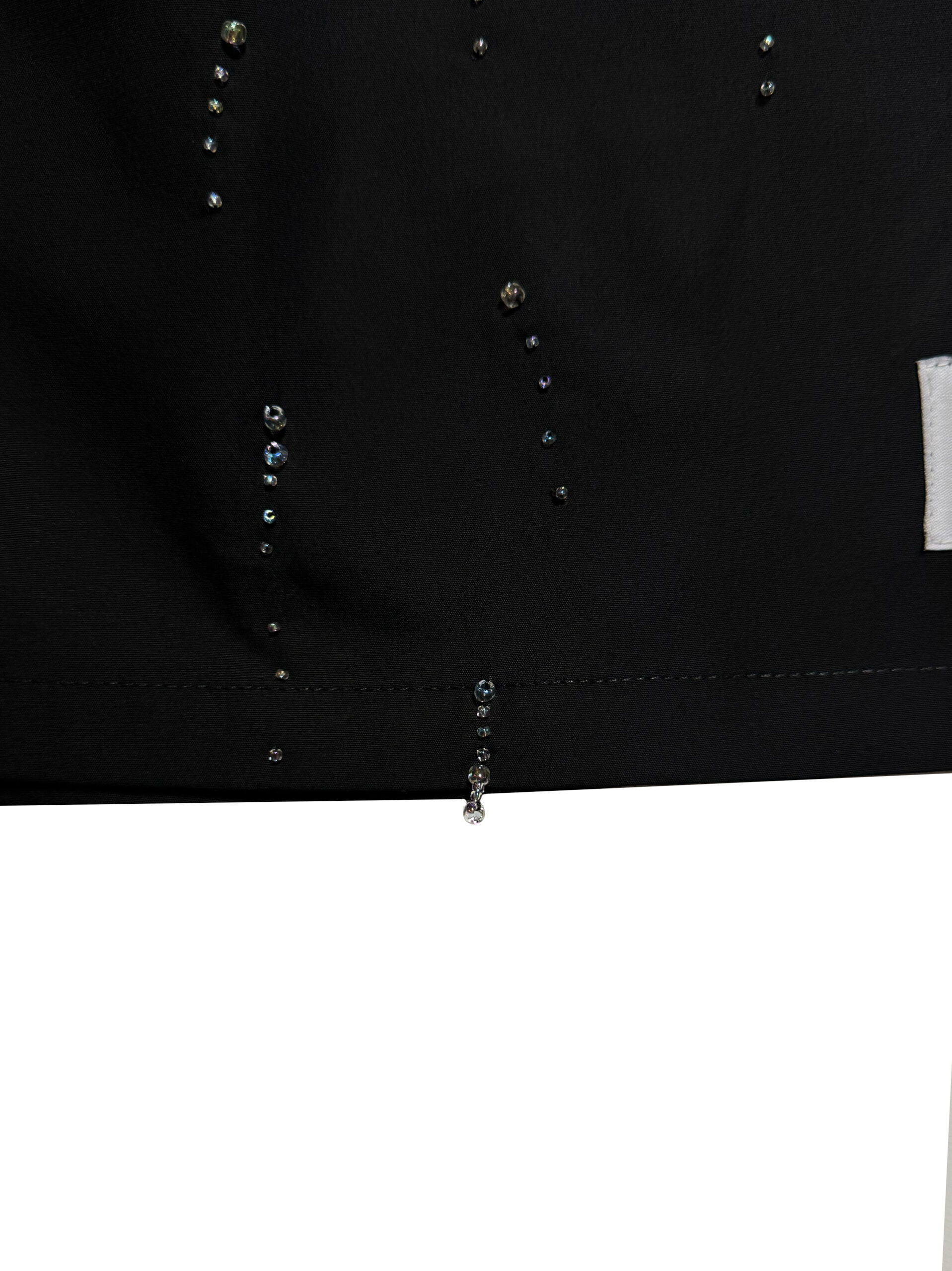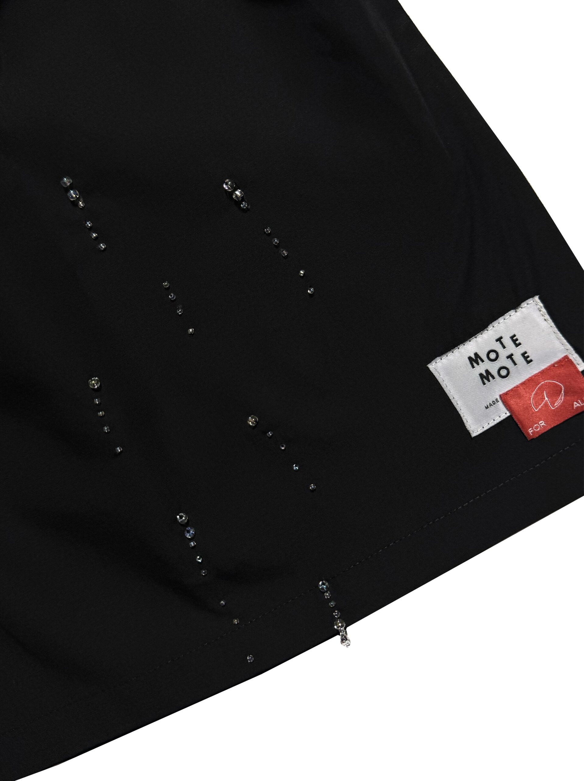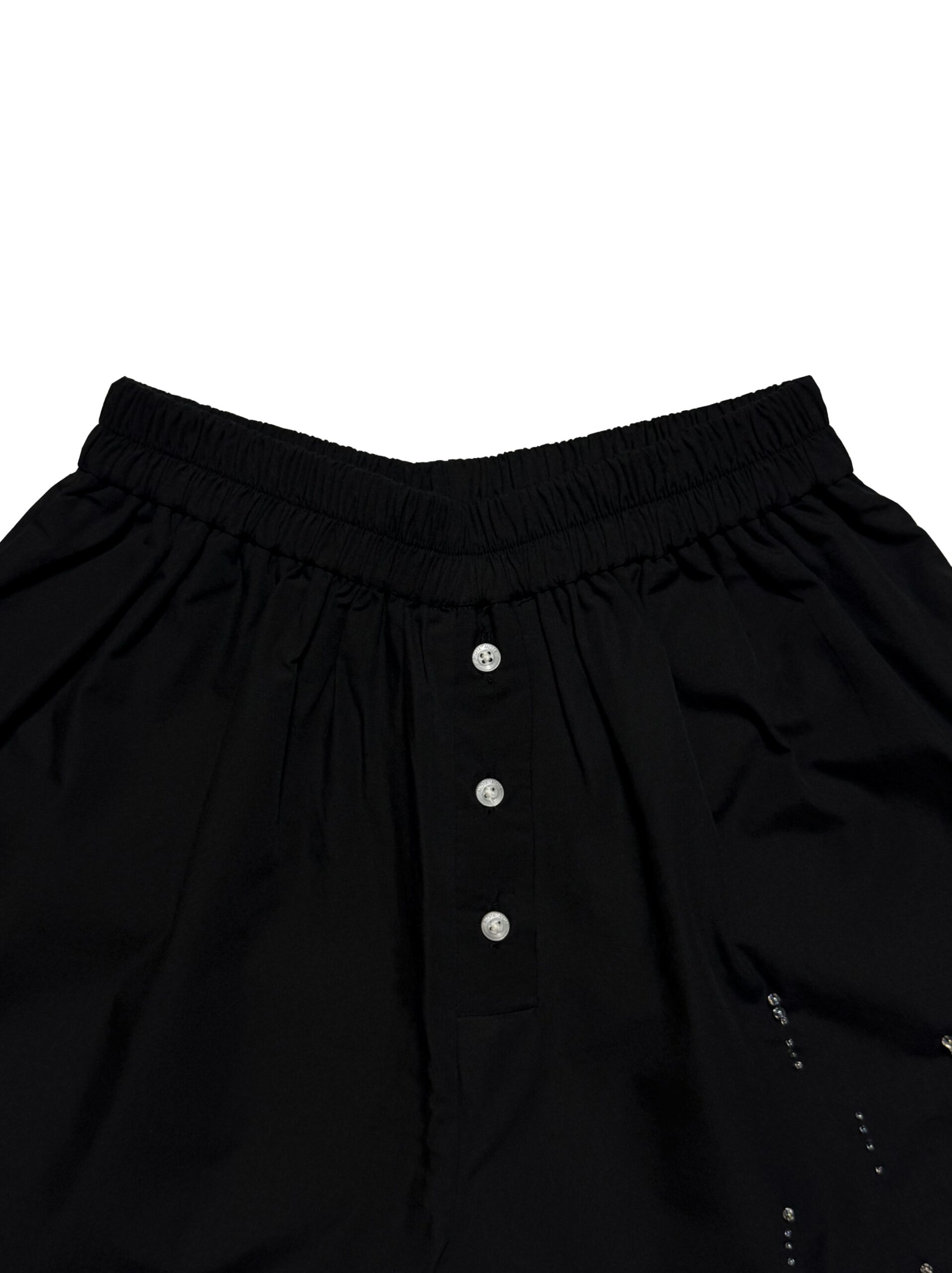 Loose-cut shorts designed with a relaxed silhouette and elastic waistband for all-day comfort. Featuring front button detailing and signature patch label. Embellished with hand-beaded cords on the side for a playful finishing touch.