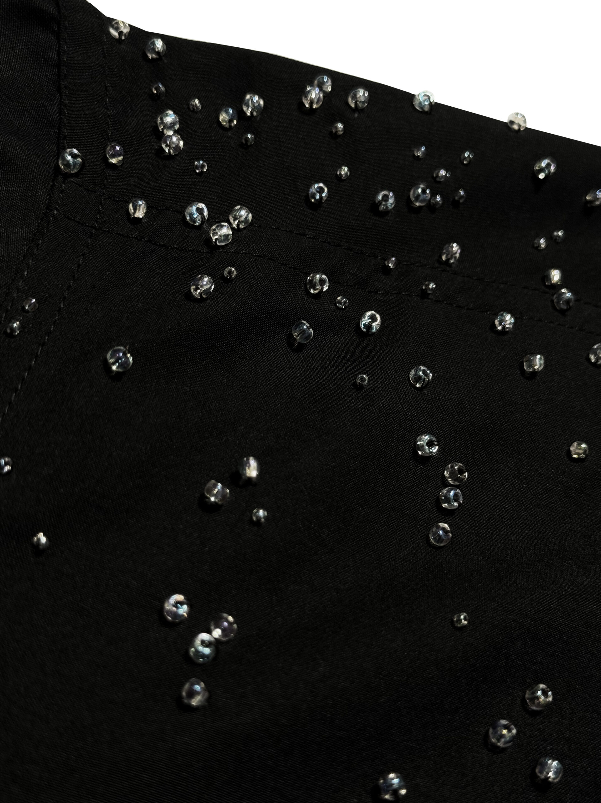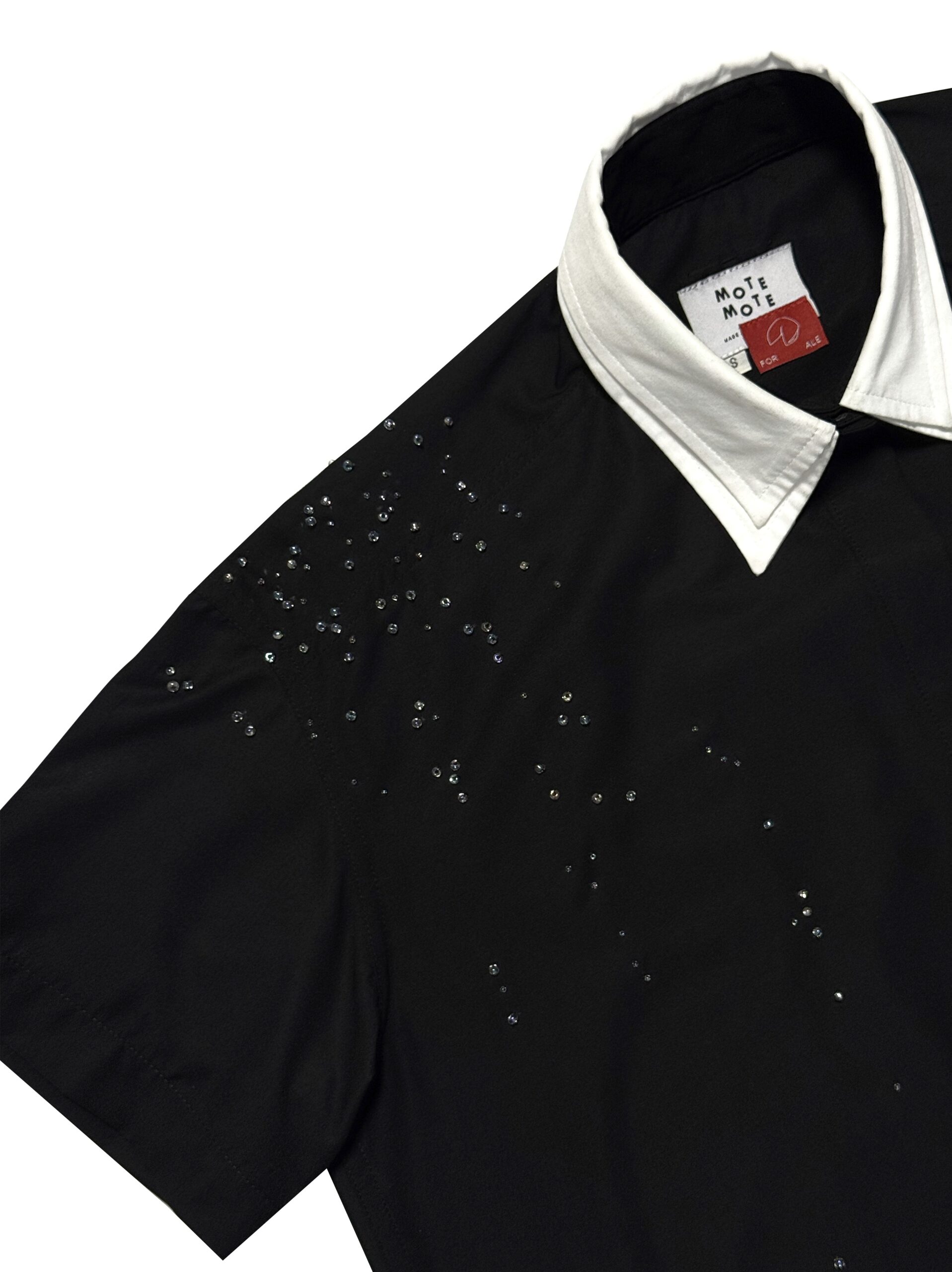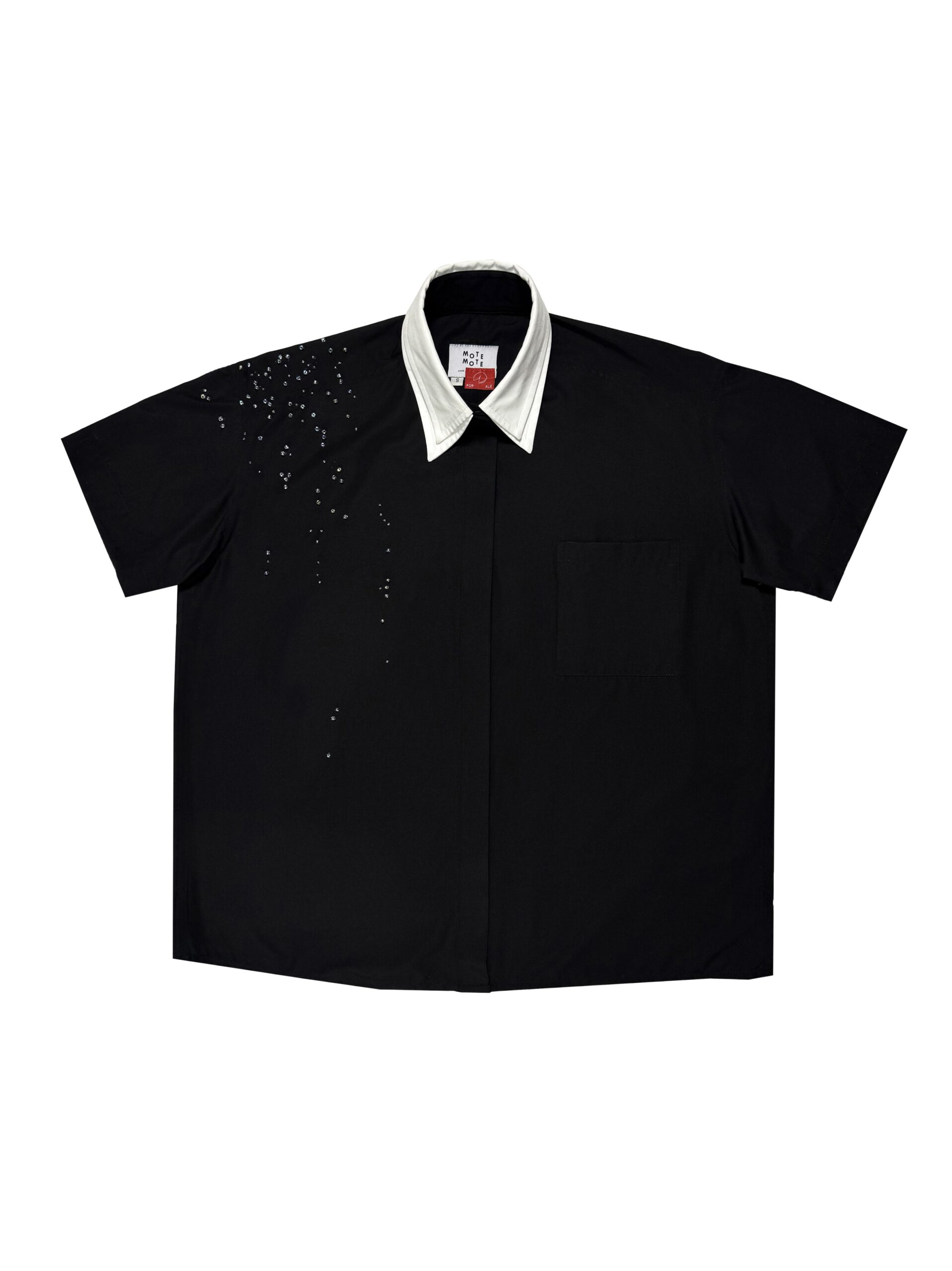 Constructed of double collared details, made in unisex fitting. Adorned with hand-beaded embellishments on the collar, neatly finished with Mote Mote’s embossed transparent buttons.