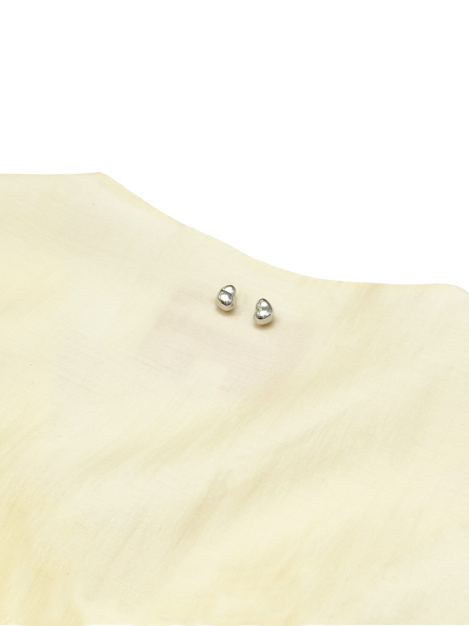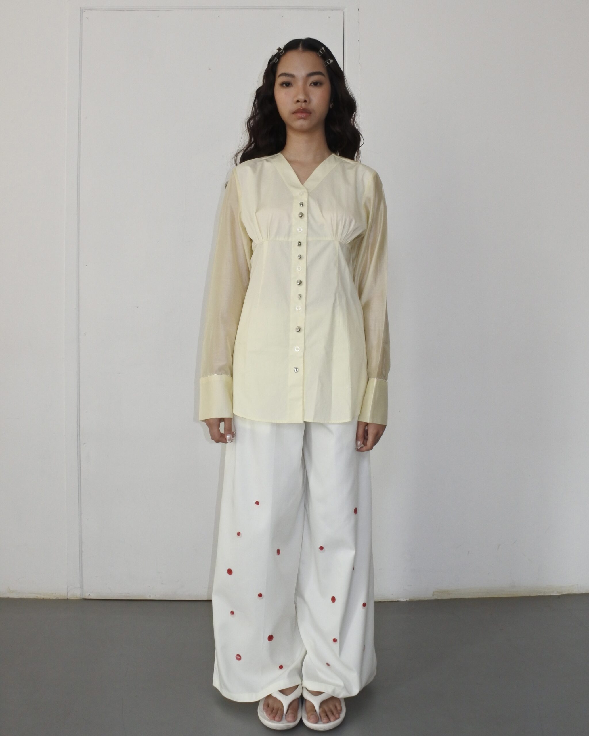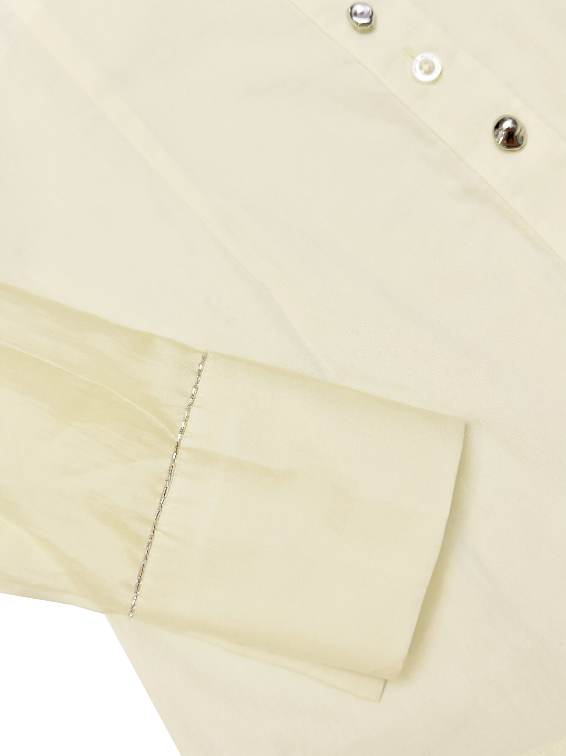 Made from a mix of silk-blend voile and 100% cotton poplin fabric implemented with hand-beaded trimmings & silver coated 3D beads, our new collarless shirt is structured with regular fitting, pleated bust-line cut & long french cuffed sleeves. Finished with matte pearlescent Mote Mote buttons.