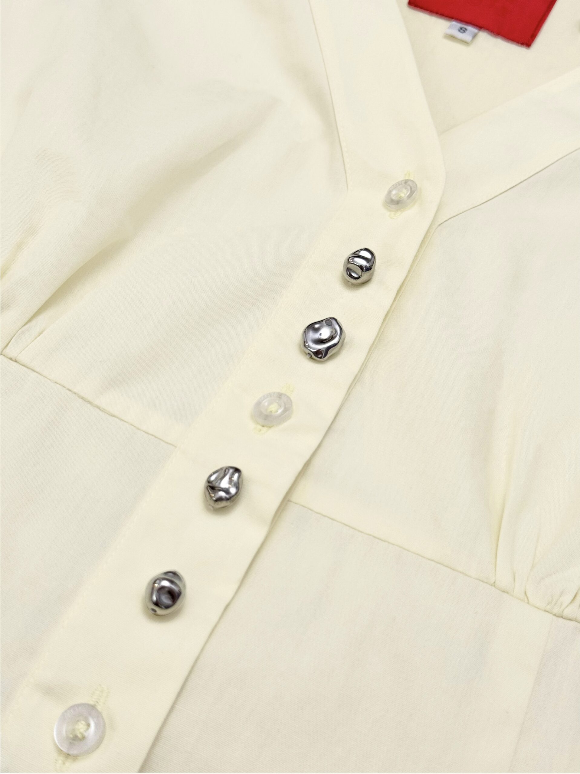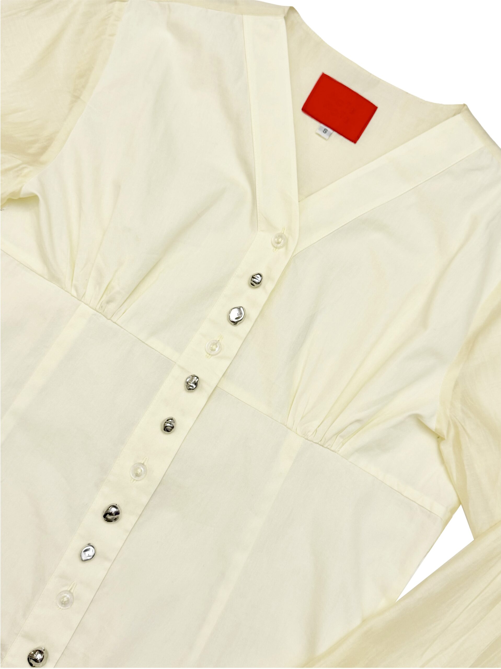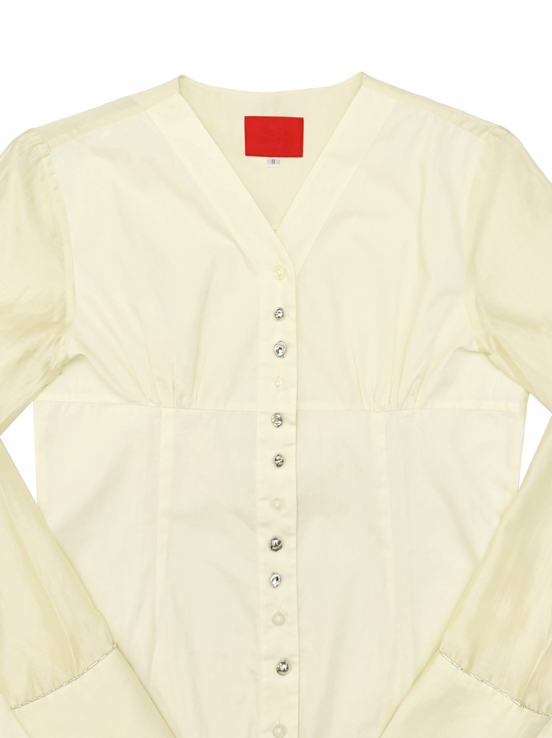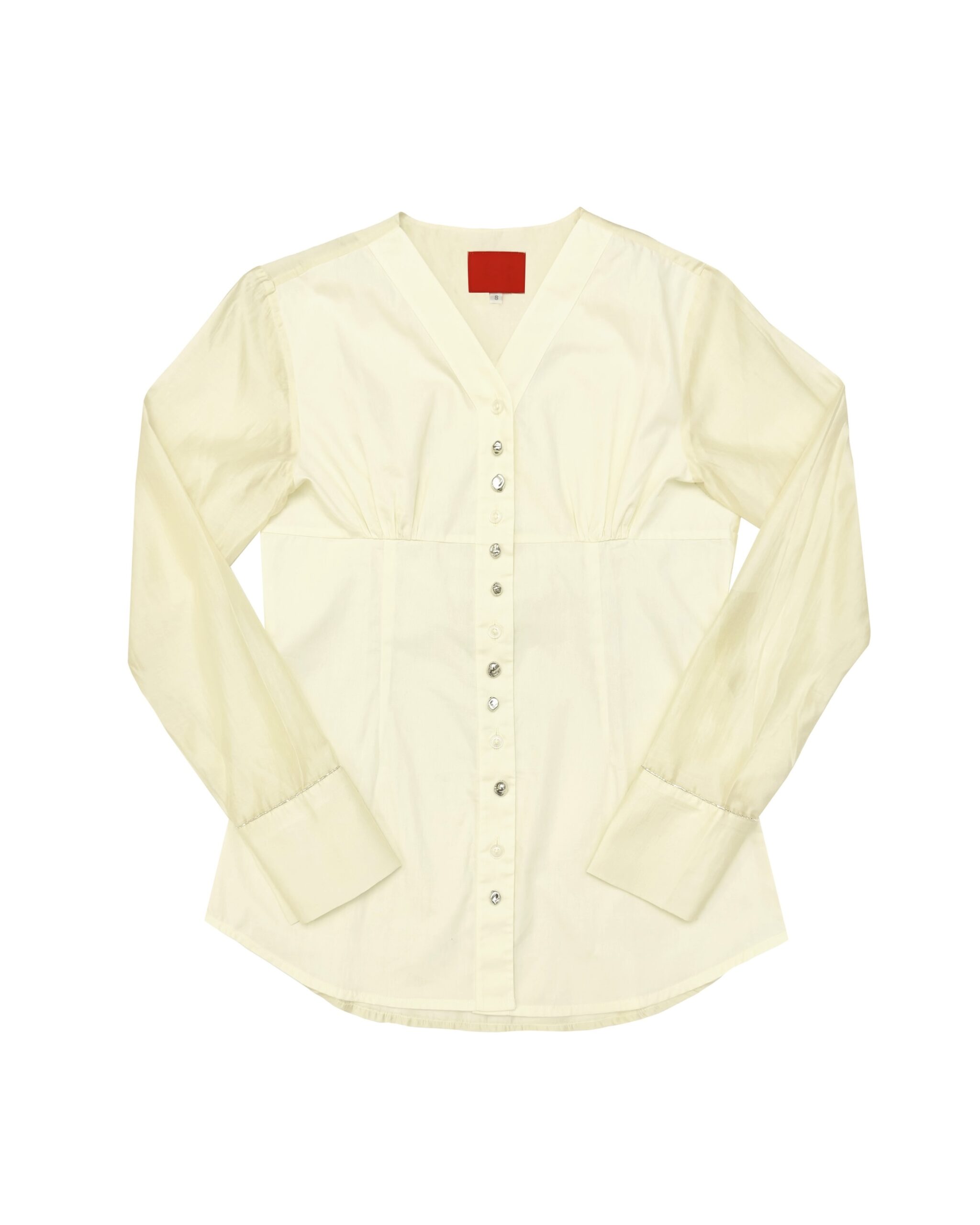 Made from a mix of silk-blend voile and 100% cotton poplin fabric implemented with hand-beaded trimmings & silver coated 3D beads, our new collarless shirt is structured with regular fitting, pleated bust-line cut & long french cuffed sleeves. Finished with matte pearlescent Mote Mote buttons.