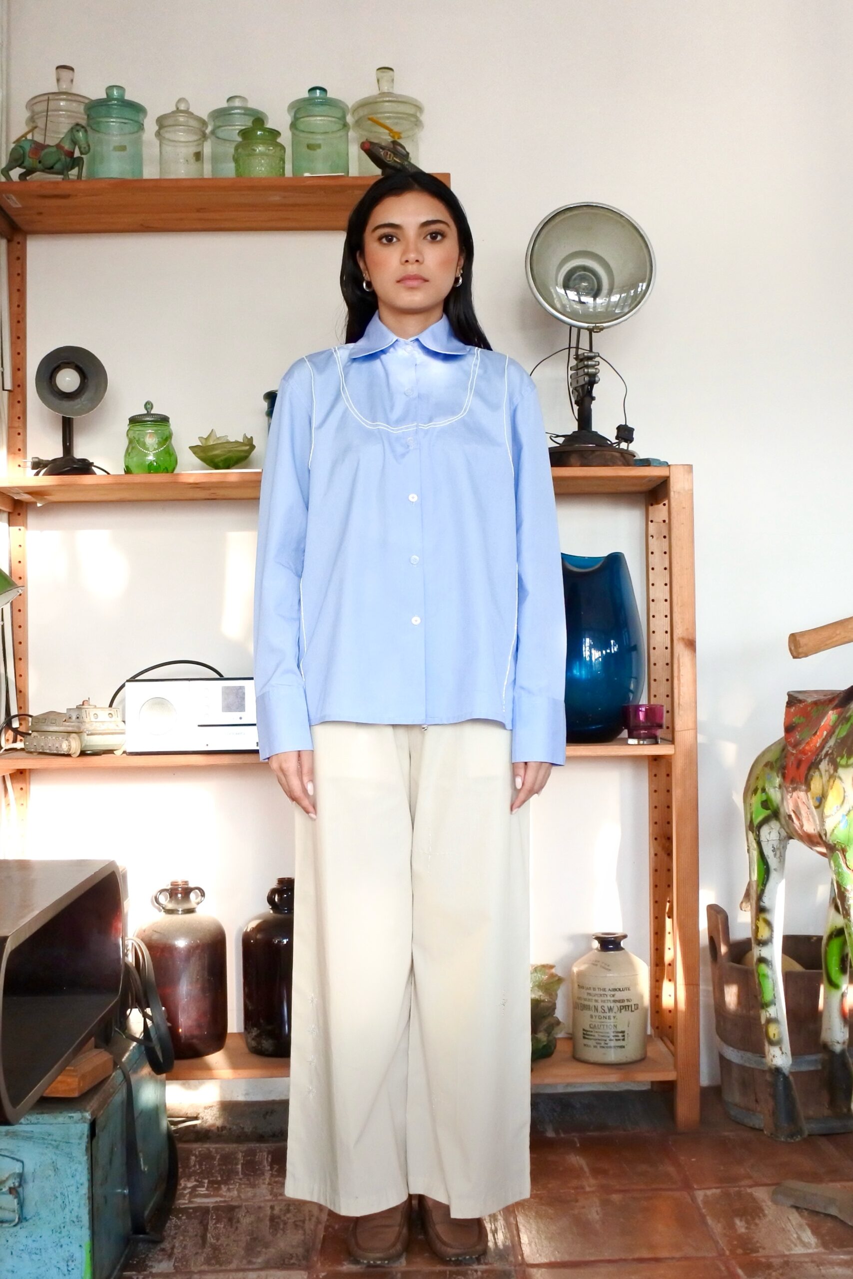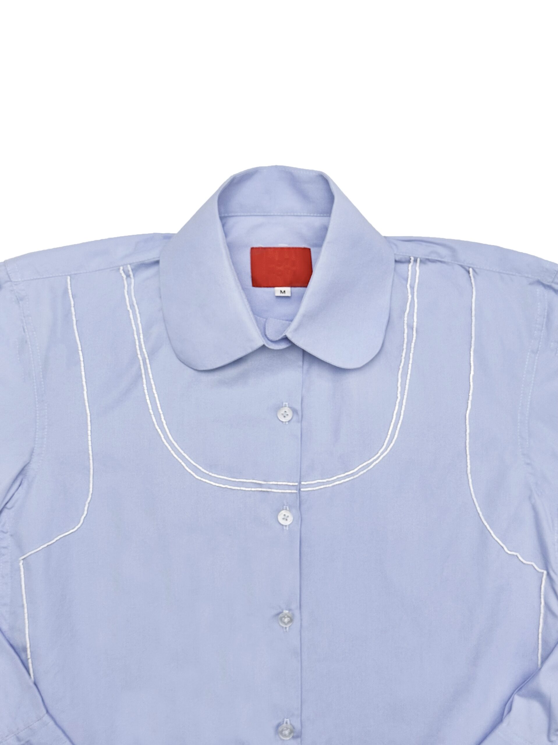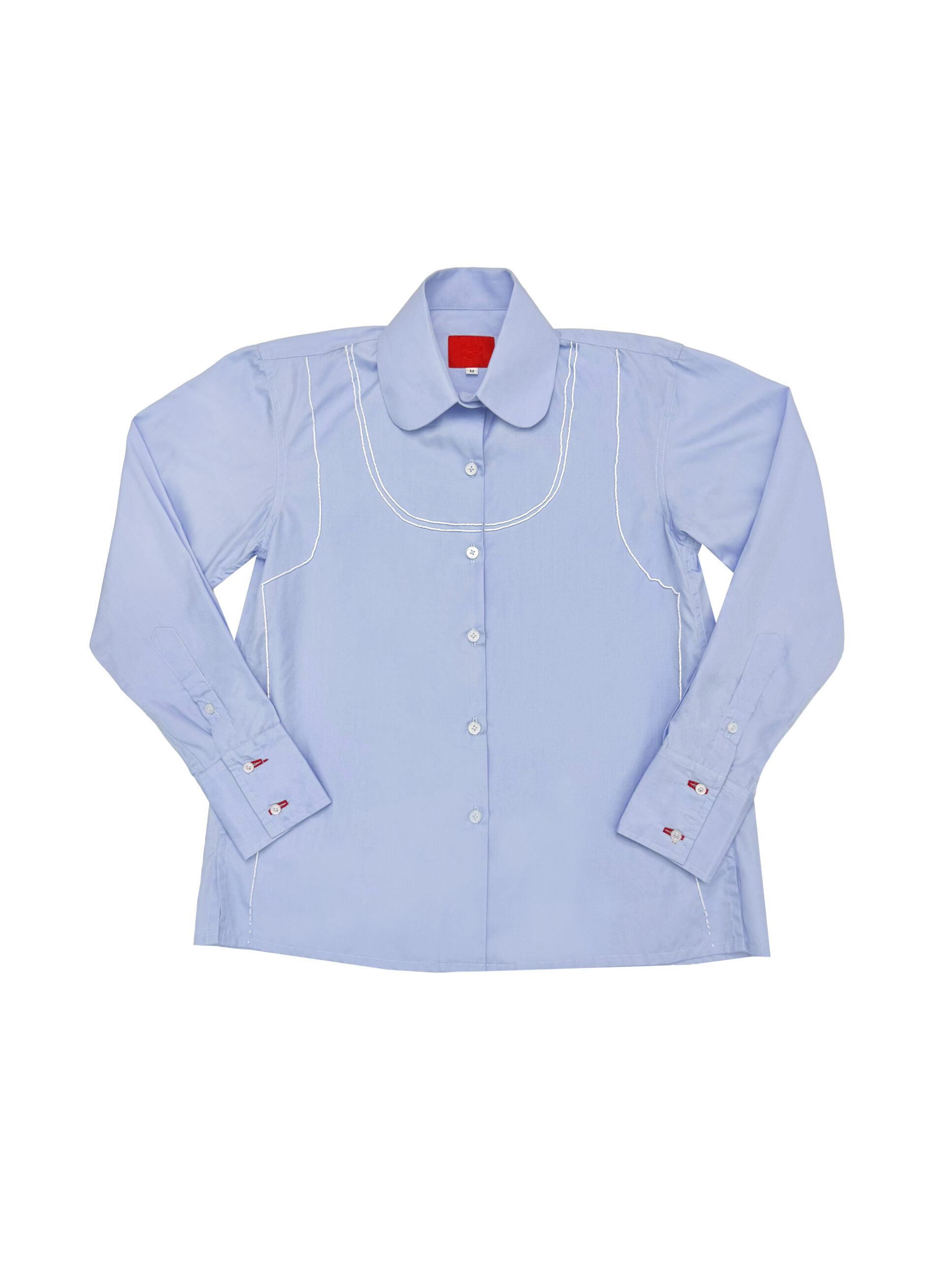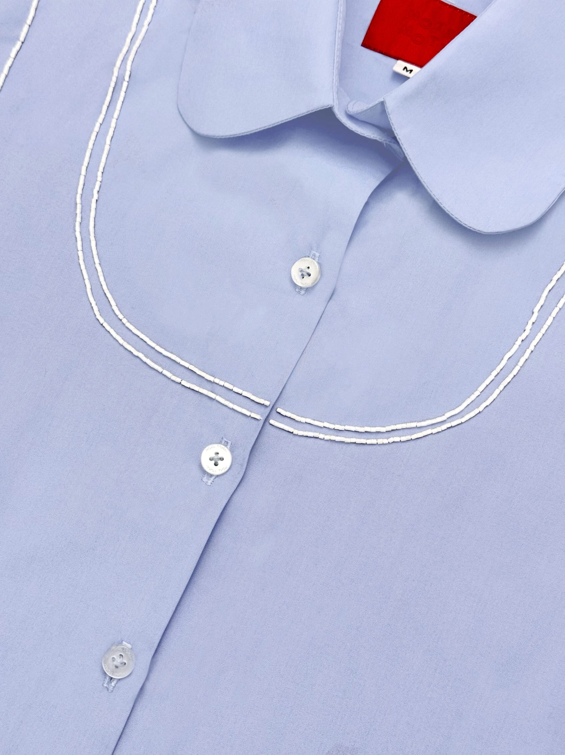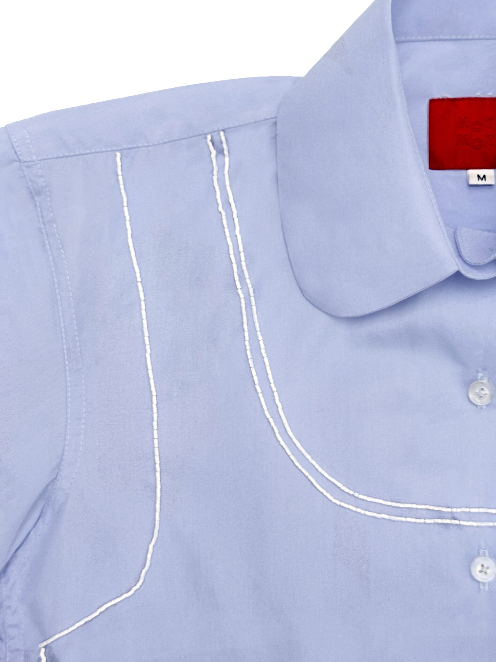 Fit to size version of our long sleeve shirts, made from cotton poplin fabric twisted with beaded tank ornaments. Finished with long french cuffed sleeves and matte pearlescent Mote Mote buttons.